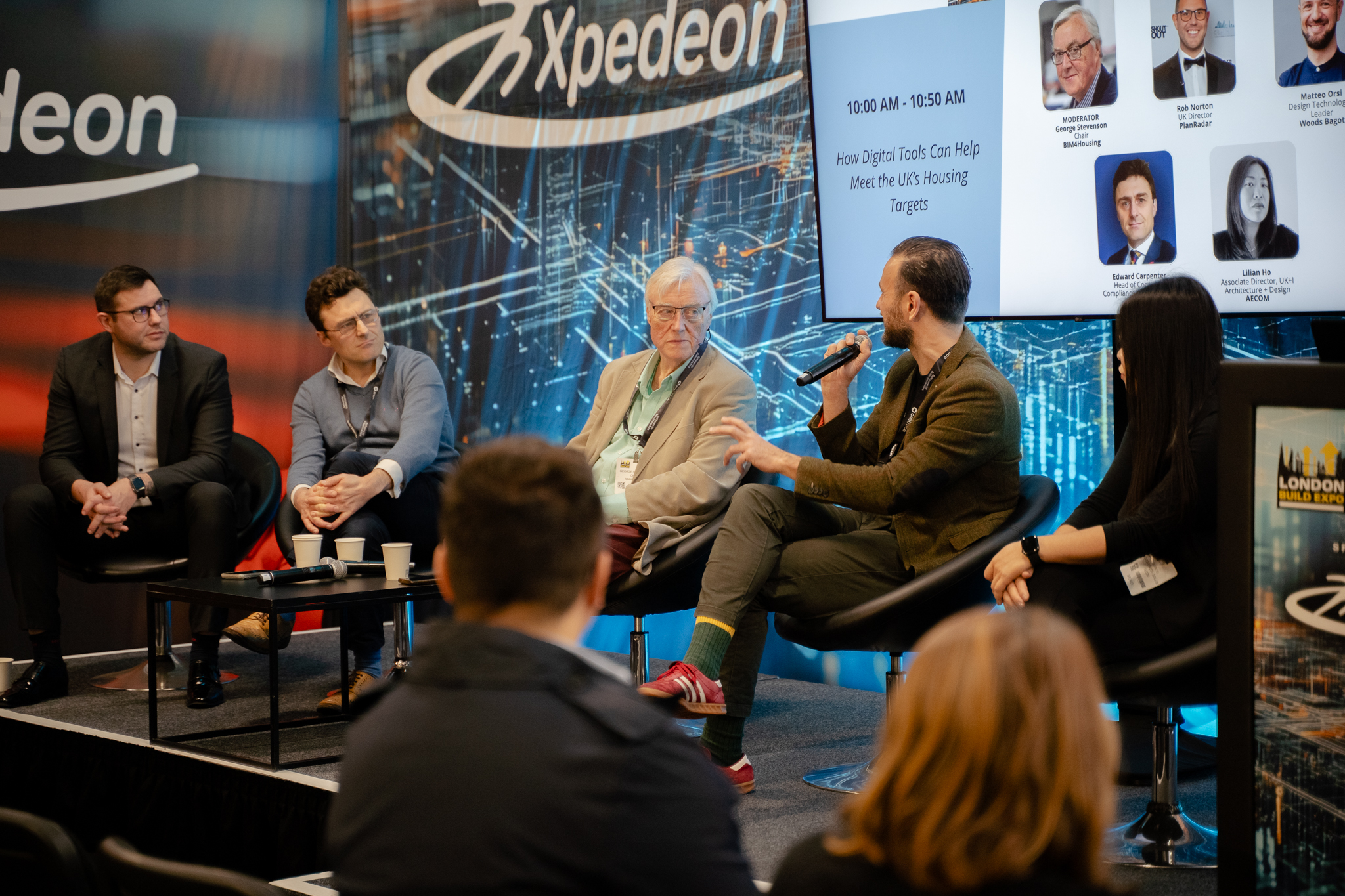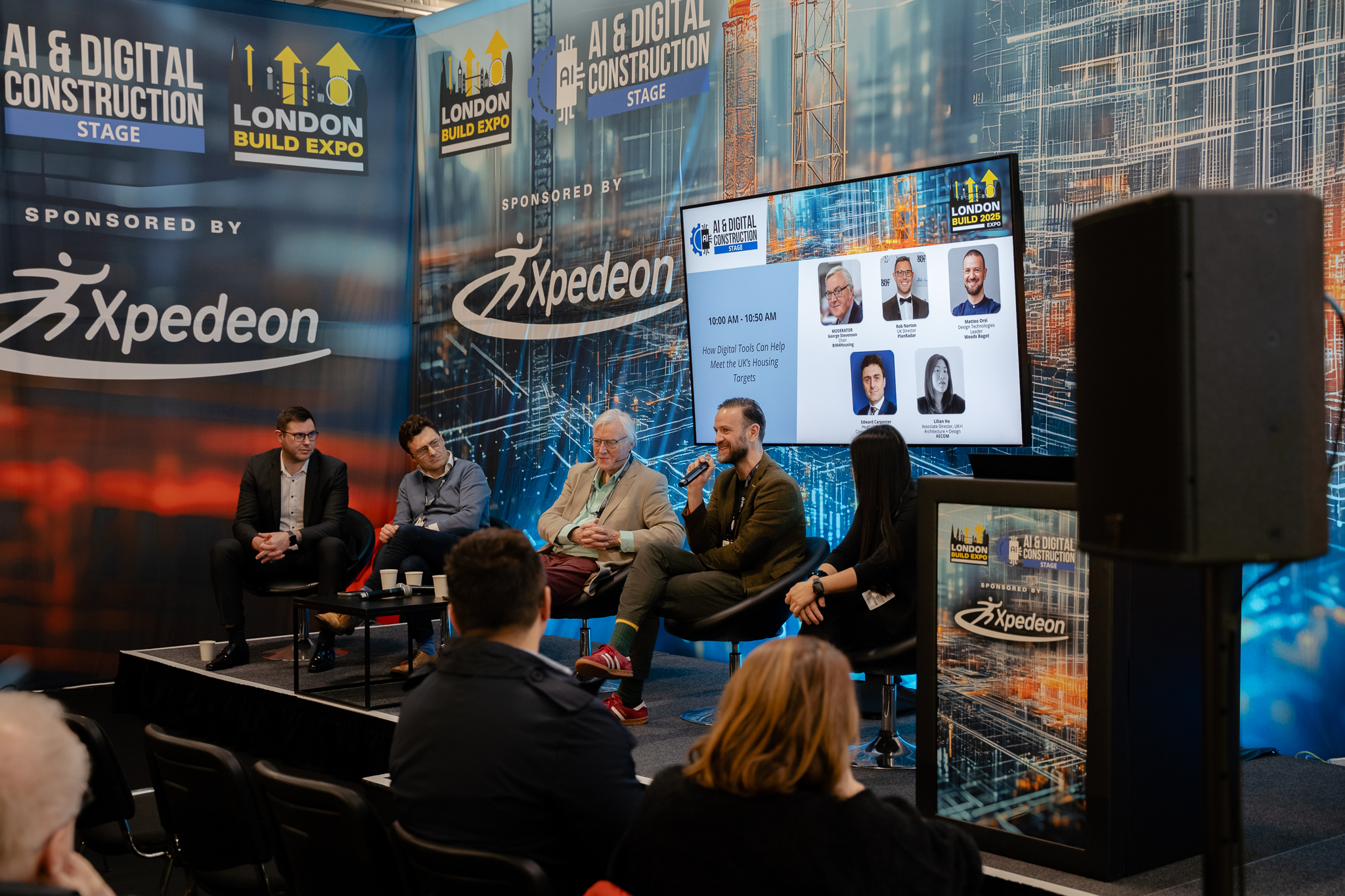 Earlier in the day, Matteo, our London Studio’s Design Technology Leader, joined a panel at the event’s AI and Digital Construction stage. Chaired by Activeplan’s George Stevenson, he was joined by Robert Norton of PlanRadar, AECOM’s Lilian Ho and Edward Carpenter from the Riverside Group.