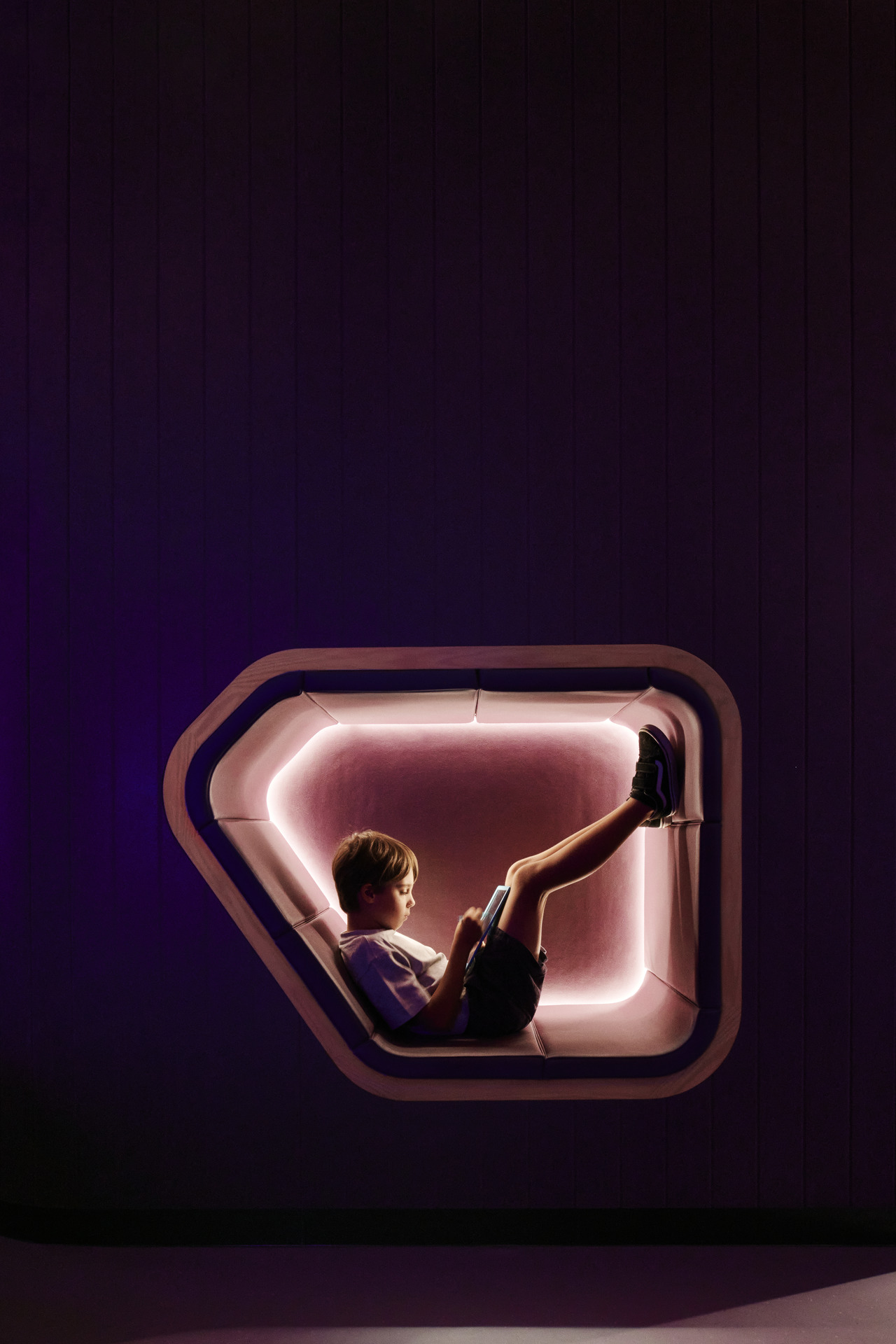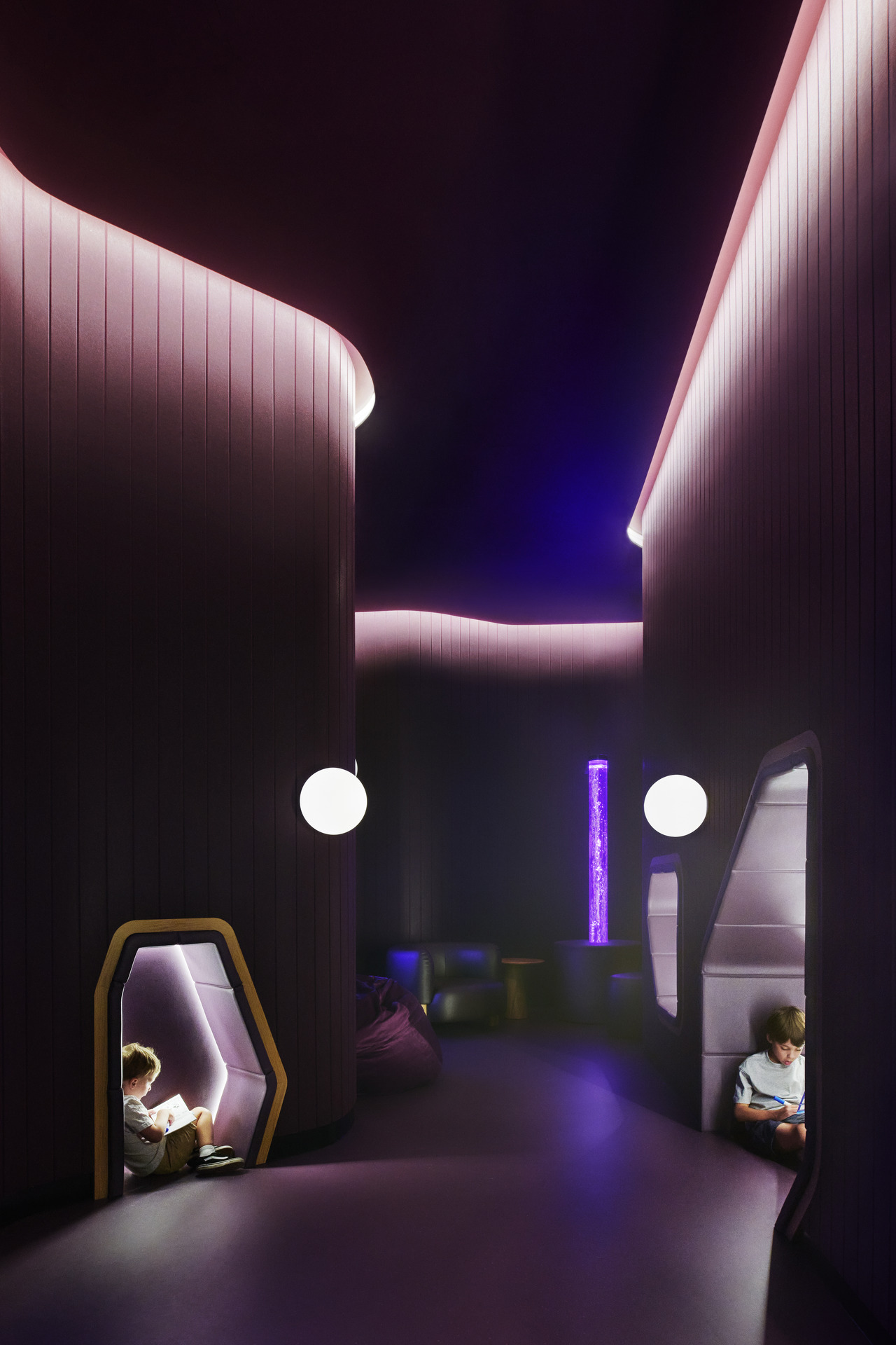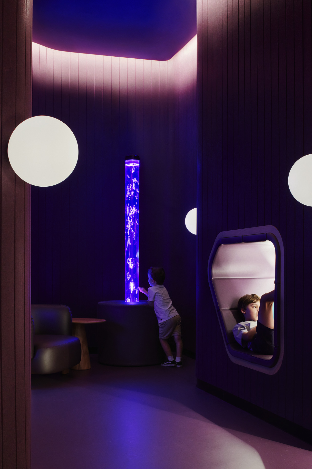 Within the new interventions, Woods Bagot designed a dedicated sensory room, providing an environment for regulation in a high-stress environment. Featuring acoustic treatments, soft lighting, integrated nooks and retreat spaces, the sensory room was recognised as an exemplary consideration by the Minister for Autism.
