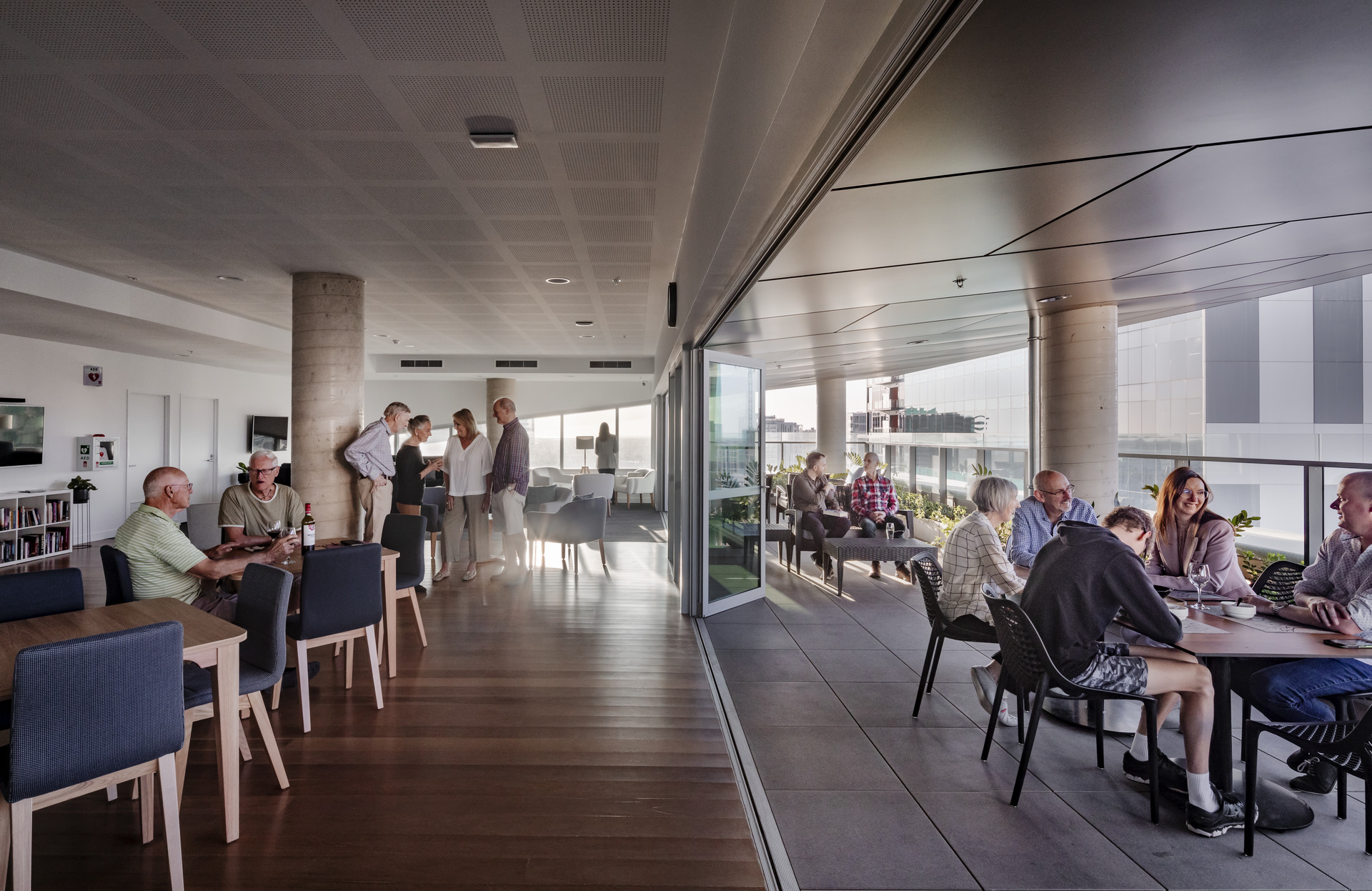 U City is a highly mixed-use development with an emphasis on inclusion and diversity, integrating retail, accessible accommodation, retirement residences, aged care, and a range of social and health services in one greenfield site. The project reimagines traditional retirement and supported living through a vertical village model that prevents age segregation, encouraging civic participation and connection through a radically diverse range of functions.