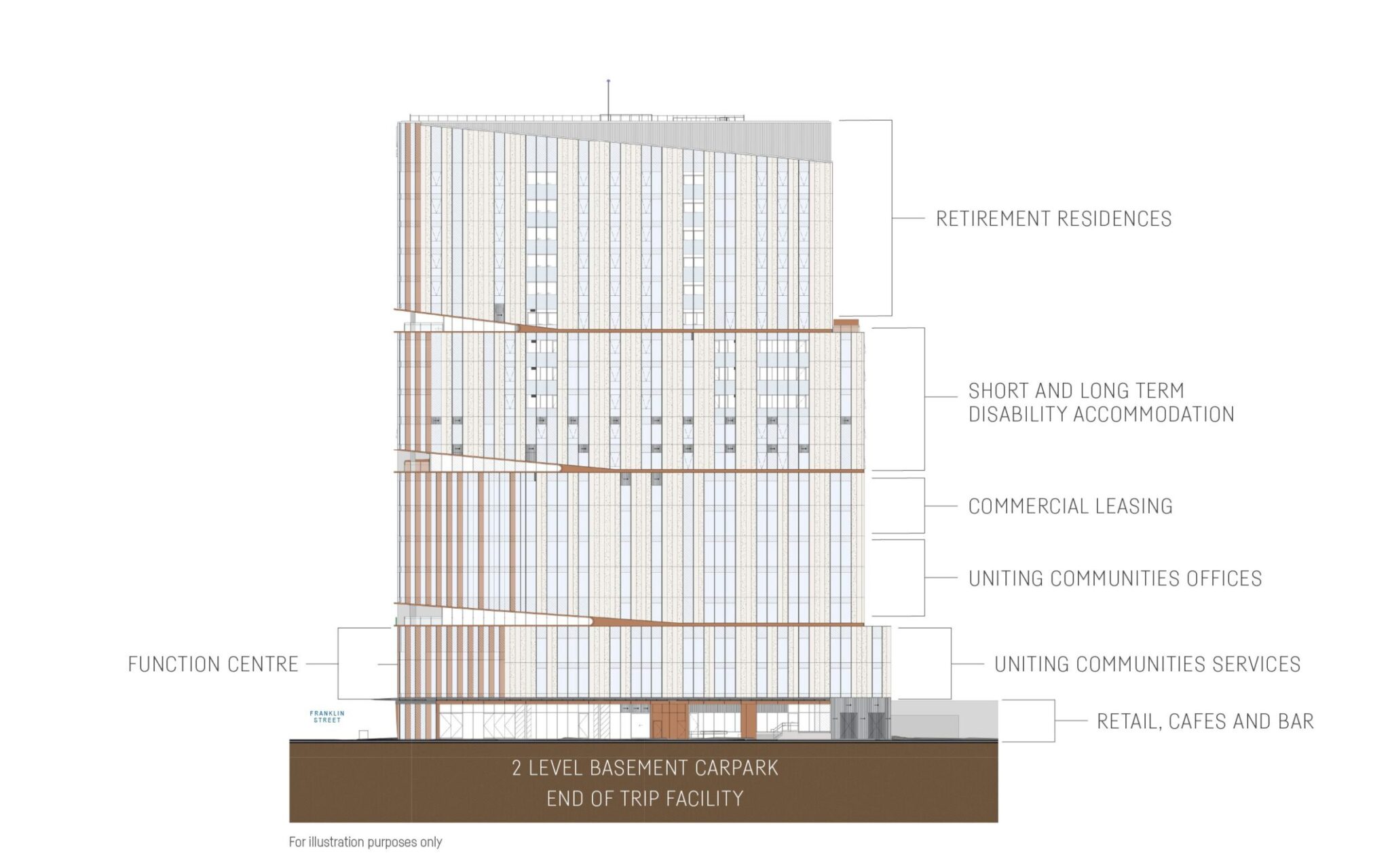 Client Uniting Communities – a non-profit organisation with an established history of caring for diverse communities – sought to consolidate its headquarters and community services with onsite retirement housing, respite and specialist disability services, while integrating spaces into the public realm. Located in the Adelaide city centre, the masterplan aims to socially connect residents and the wider community through an integrated masterplan that facilitates interaction, supports intergenerational connection, and invites public participation.