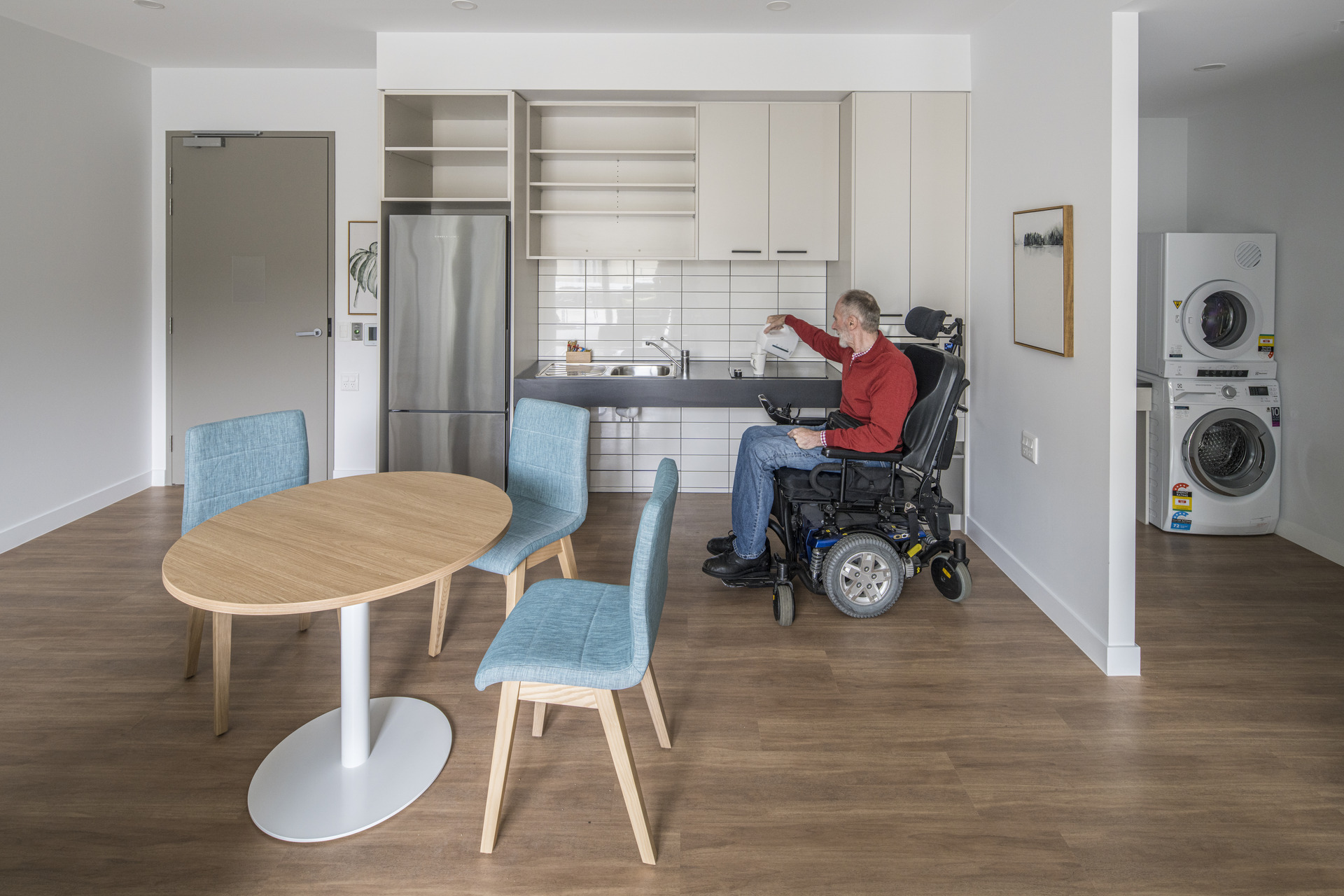 Specialist disability units feature adjustable bench heights, flush thresholds, wide turning circles, and other ageing in place considerations.