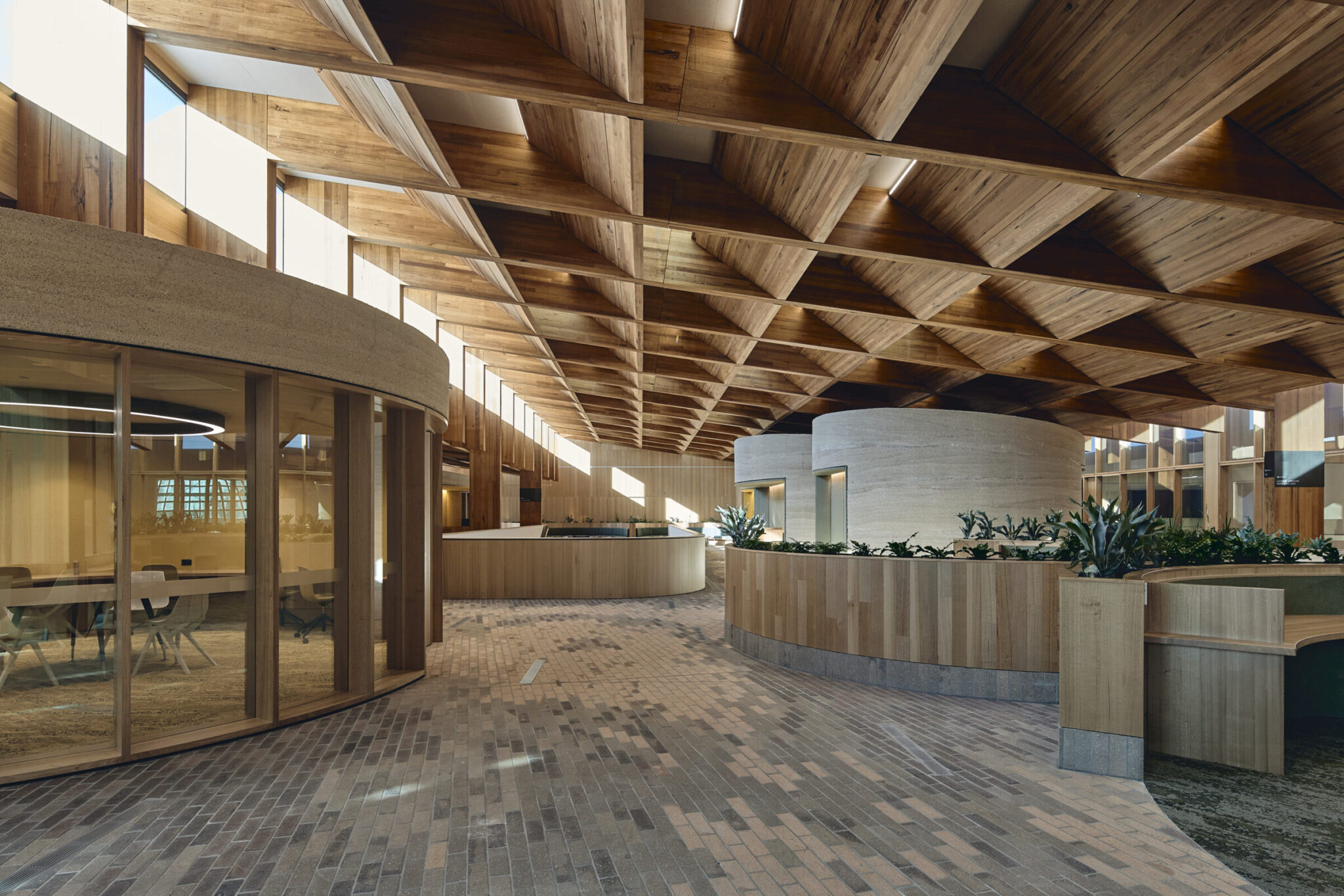 The campus characterised by vibrant civic spaces, underscored by a connection to place through a design that appeals to the senses by introducing fresh air, natural light, biophilic design principles, native greening. Incorporating a strong overlay of craft and materiality, the campus design uses locally sourced materials used in their honest forms, with minimal applied finishes, leaving natural grain and textures exposed.