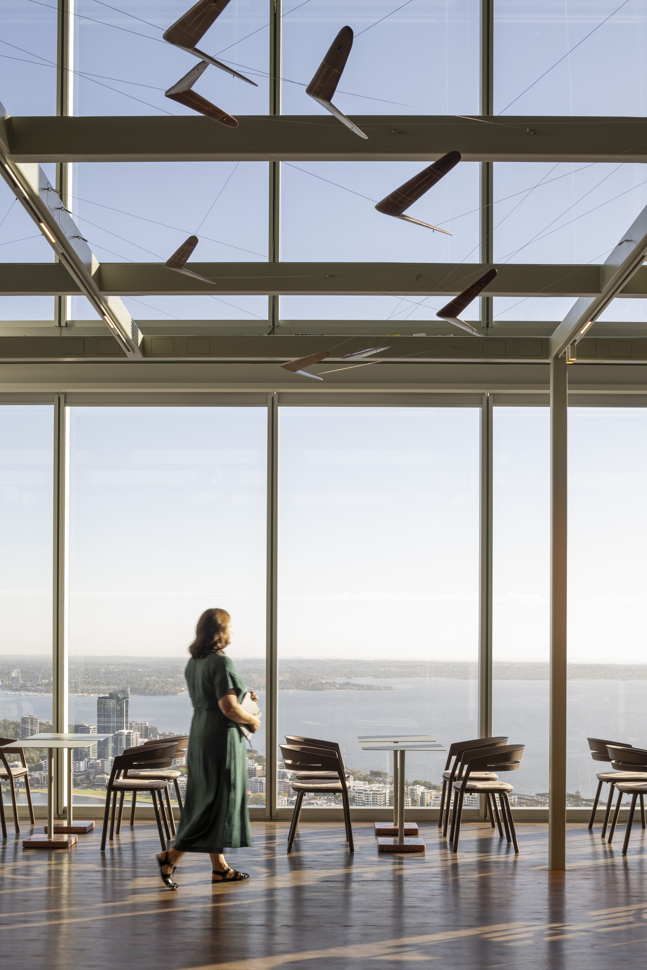 The crown jewel of this vertical landscape is Level 45’s Sky Terrace—a triple-height space with panoramic views that transforms the building’s summit into an employee-centric indoor community hub. Here, expansive views connect occupants to the Derbal Yerrigan (Swan River) while offering diverse spaces for social connection, focused work, and contemplation. It’s workplace design that recognises the psychological importance of horizon lines and natural light in a city where both are abundant.