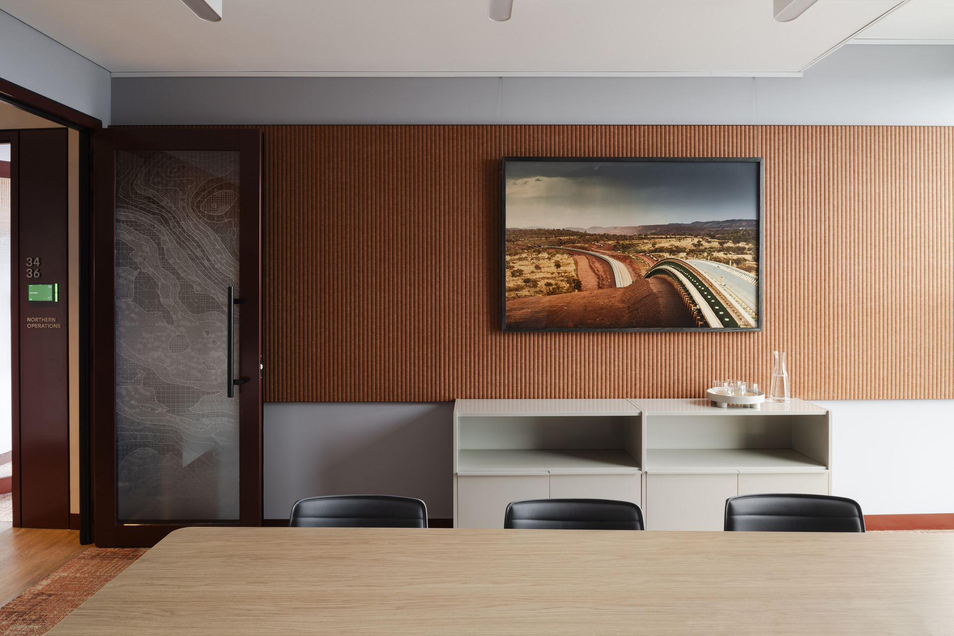 This aesthetic storytelling is a strategic approach to workplace design that acknowledges the duality between intimate human scale and the vastness of the landscapes where the client operates. The result is a space where a site worker feels as welcome as a corporate executive, achieved through carefully chosen raw materials, including nickel displays in the lobby and repurposed furniture and fixtures from site offices positioned throughout the space. The design is a canvas for thoughtful art curation, including commissioned First Nations artworks and vivid large-scale photography from the client’s operational sites.