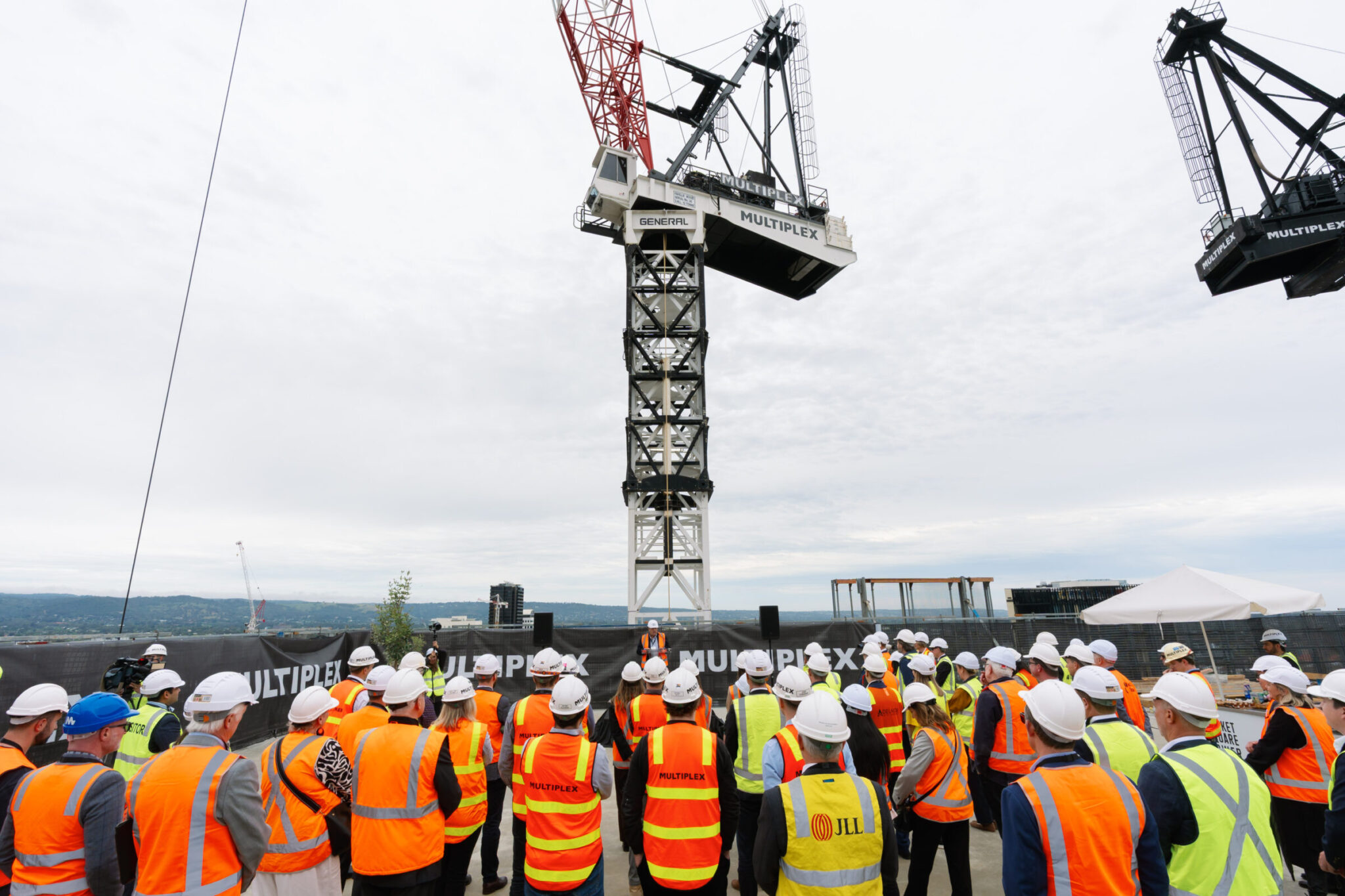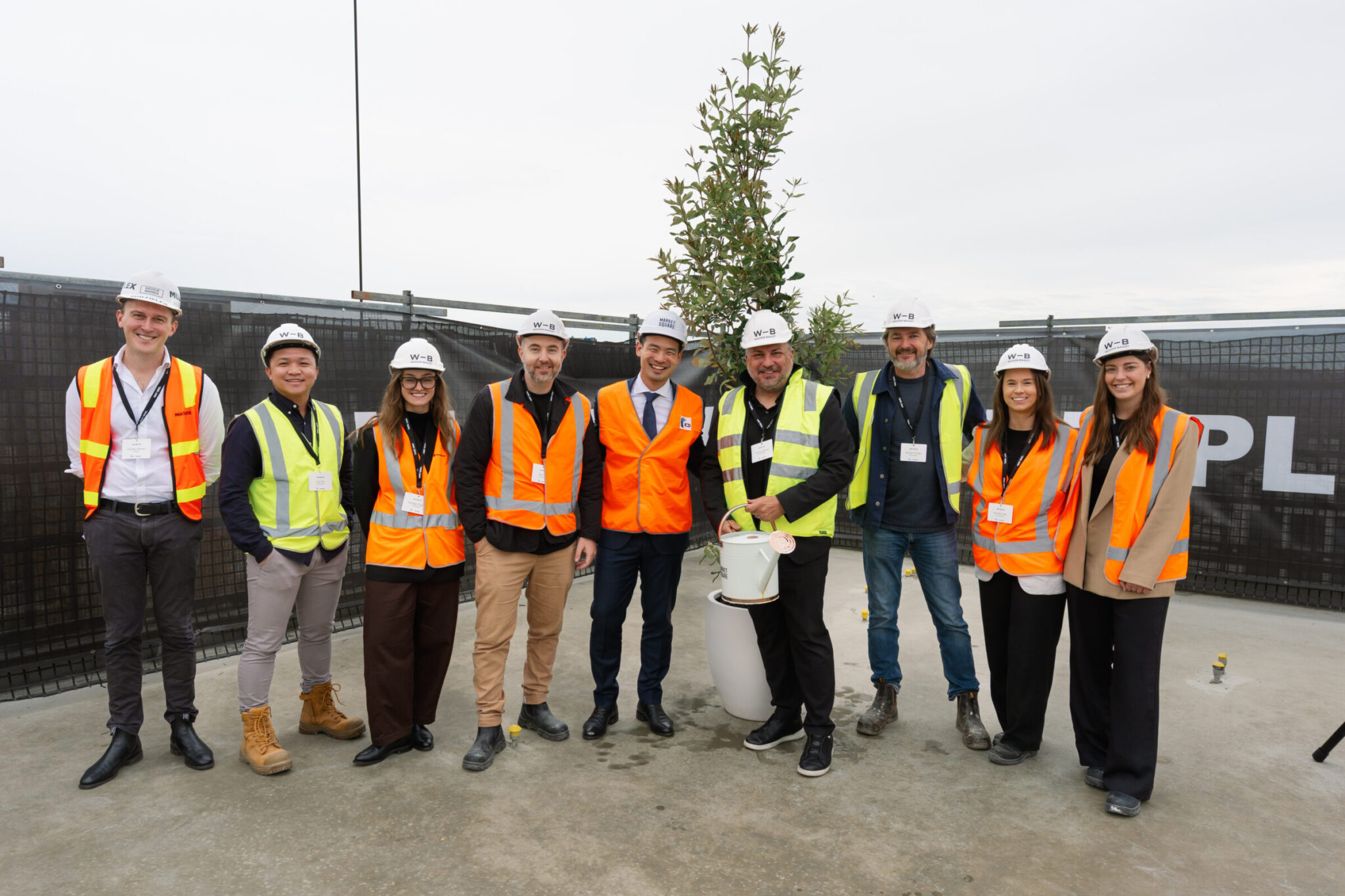 The nine-level tower reached its maximum height of 56 metres with the Gouger Street structure now completed. Project partners gathered onsite to mark the achievement, placing the ceremonial topping-out tree on the building’s highest point.