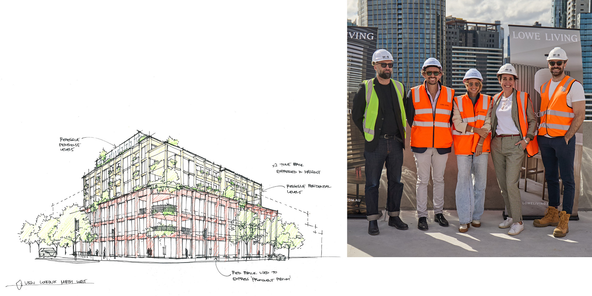Left: Concept sketch of Emerald Place. Right: Tim and Emma Lowe together with the Woods Bagot Team, Brad, Ana and Grant.