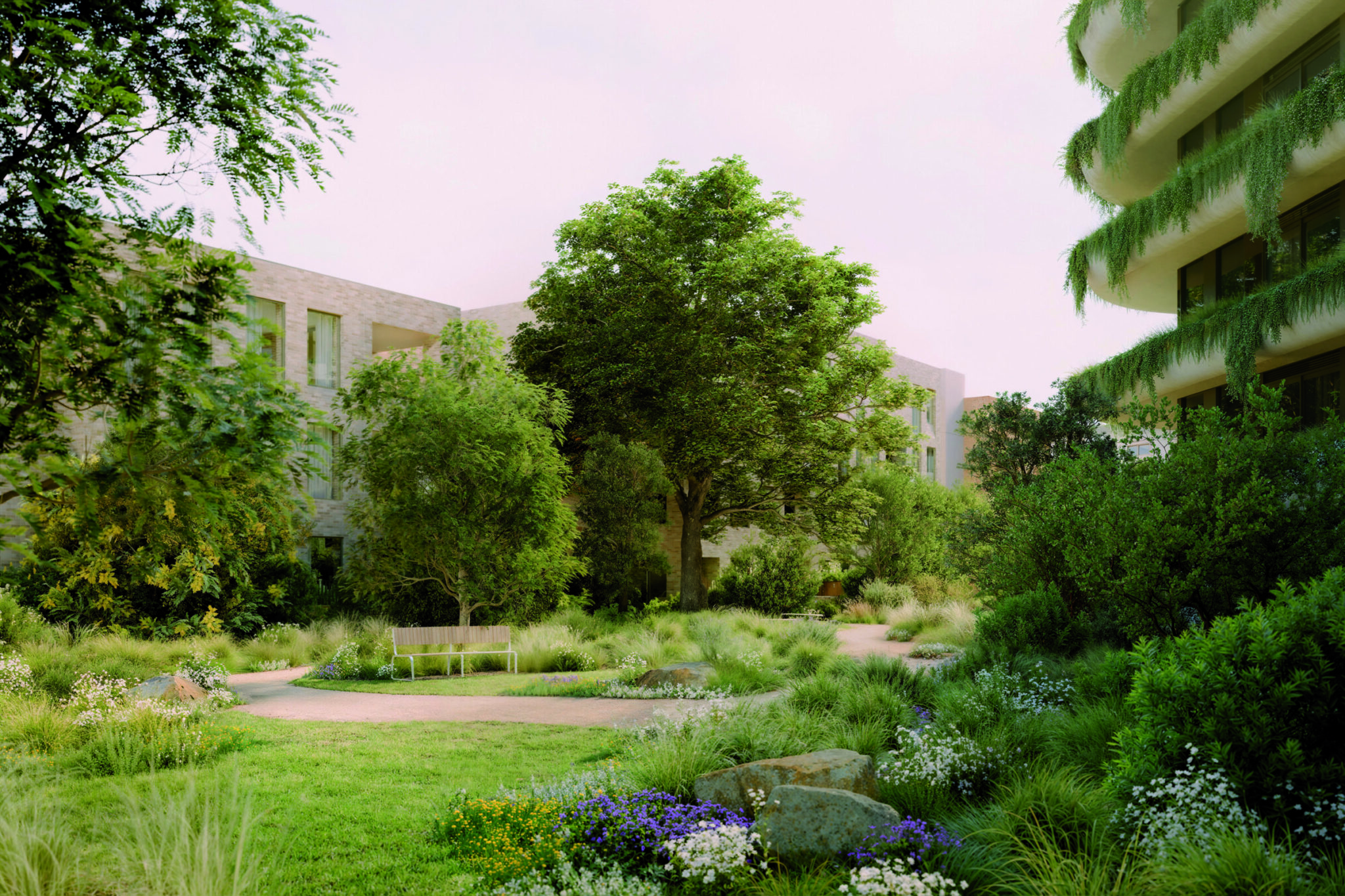 At the heart of the scheme, embedded in the landscape and bathed in northern light, the Meadow provides outlook for all inward-facing residences. Beneath it, lower-level amenity spaces remain private and secluded while still enjoying abundant natural daylight and access to the shared gardens. Accessible gardens at ground level foster communal interaction, and moments of water along the pedestrian spine acknowledge the site’s proximity to the Yarra River, creating calm and reinforcing a connection to country.