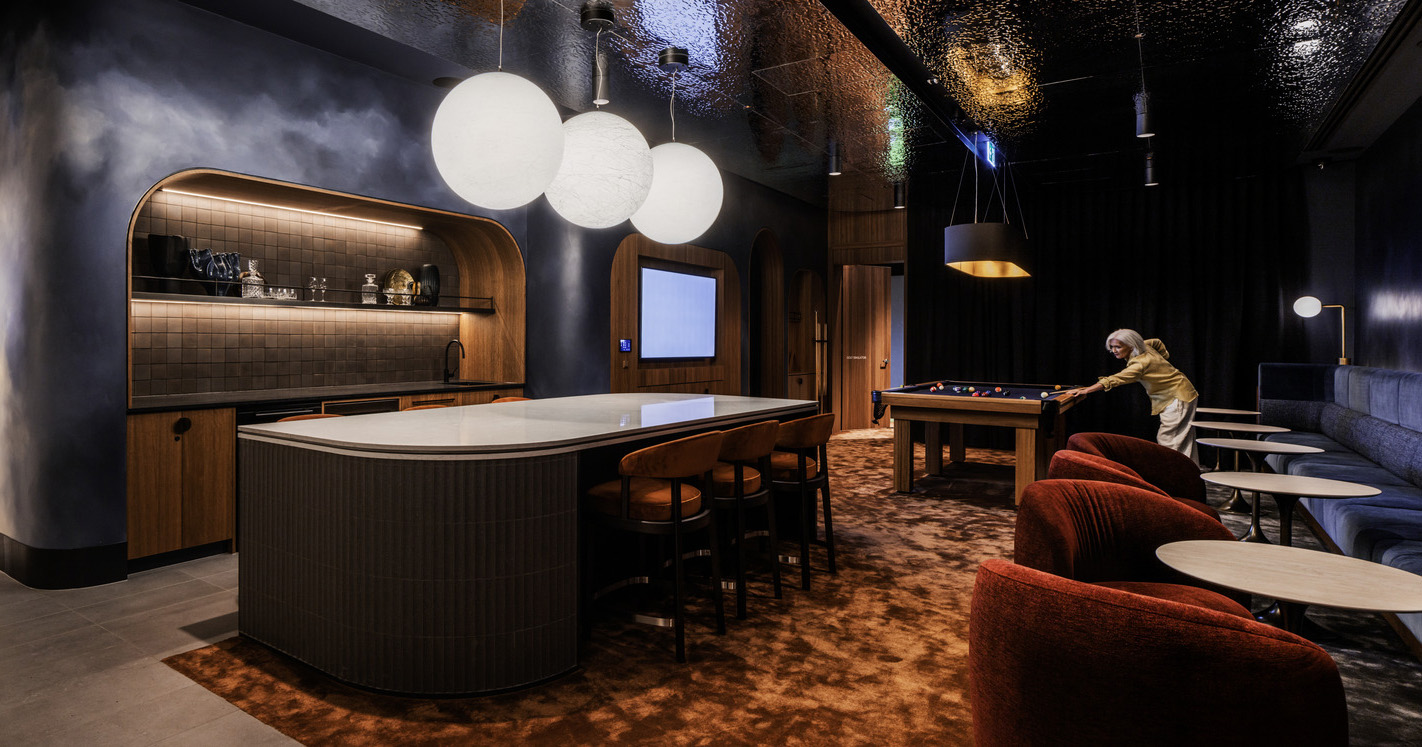 These include a wellness centre, cinema, library, greenhouse, community gardens, arts and craft studio, pool, gym, yoga/pilates studio, hairdresser, chapel, golf simulator, pool table lounge, business meeting rooms and multiple dining areas, both private and shared. Among them, the speakeasy-style bar offers a distinct experience. Tucked beneath the main dining area, it is low-lit, acoustically tuned and designed as a sensory shift — moving from day into dusk. Conceptualised around the Australian bush at night, it brings a different tone to the precinct: immersive, intimate and socially charged.