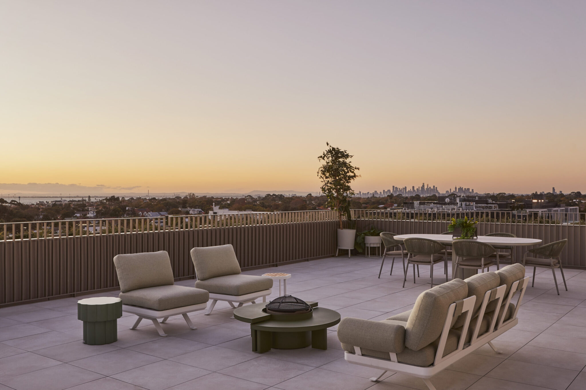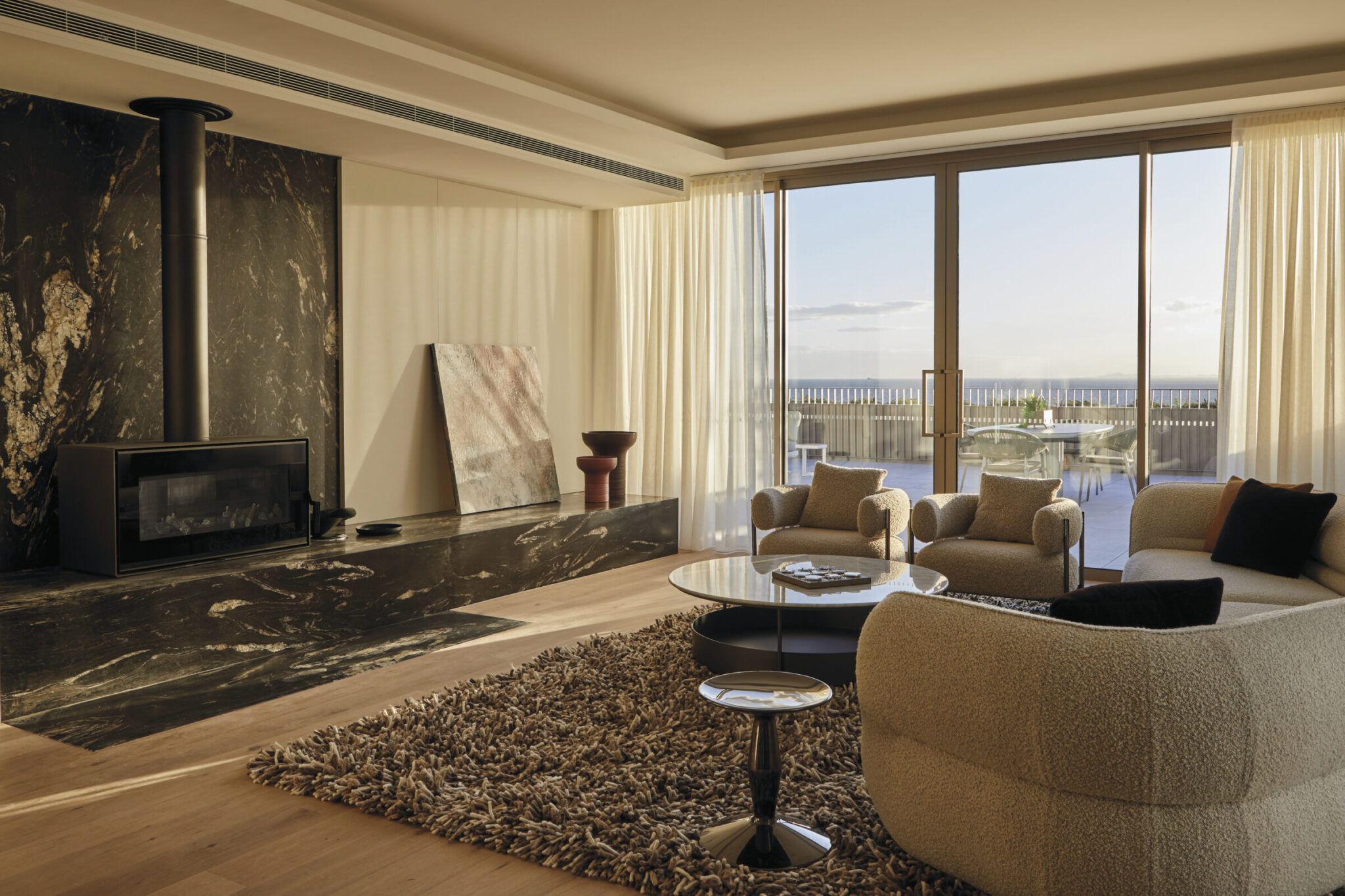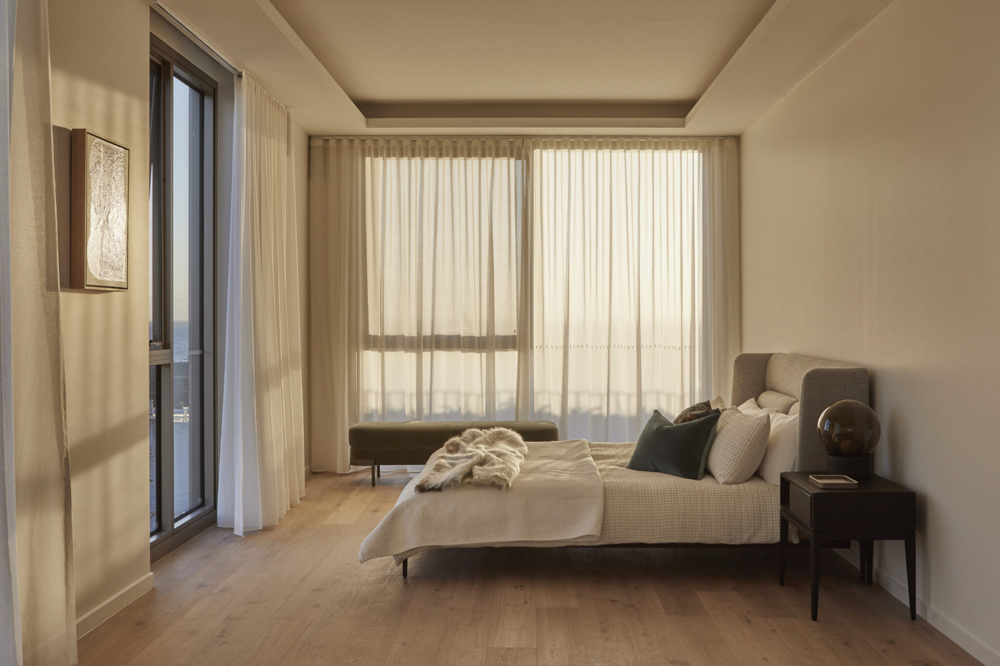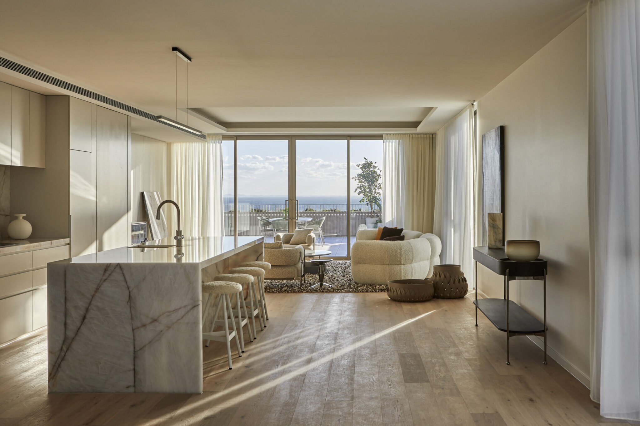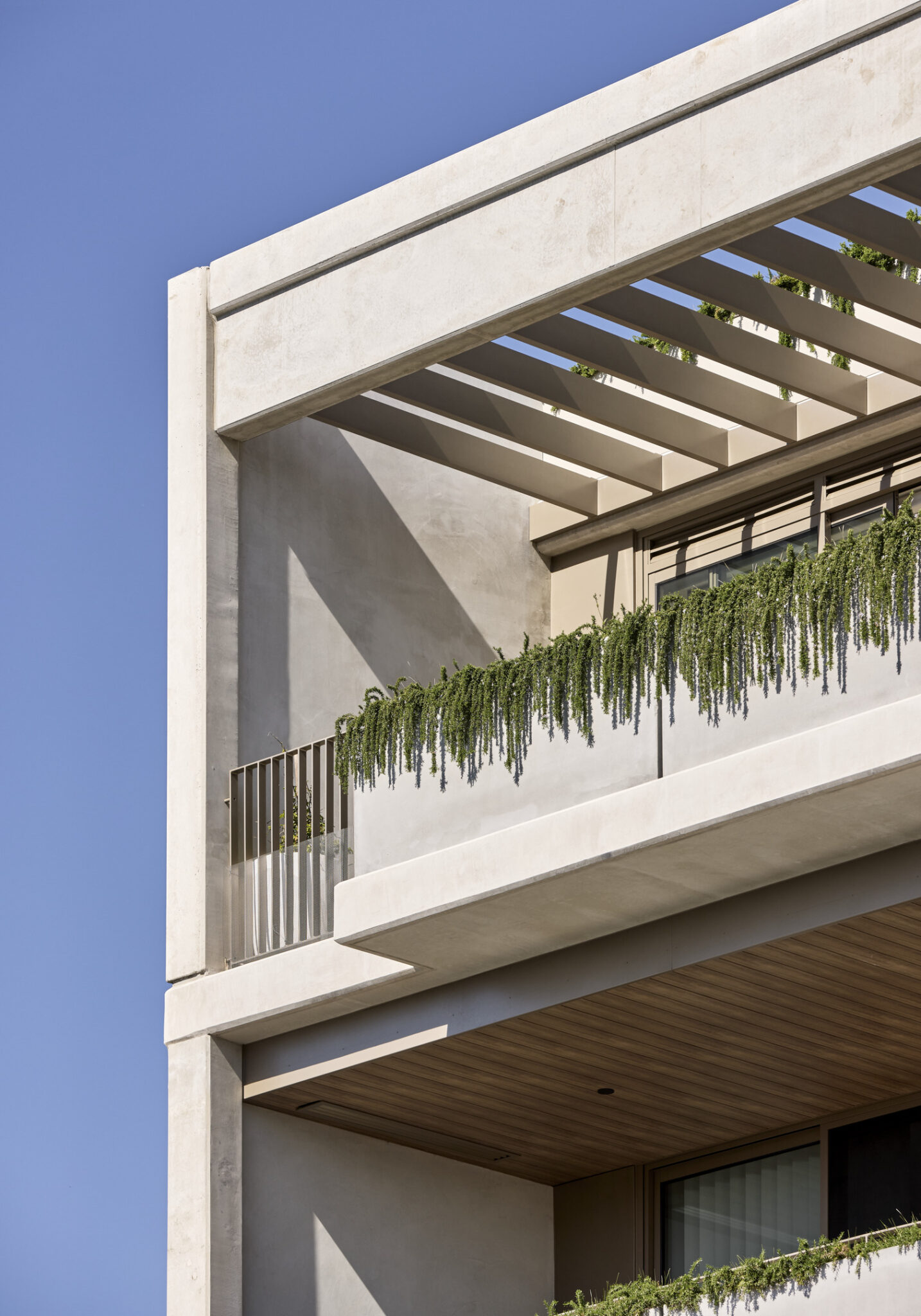 The warmth of the timber soffits to the balconies is drawn into the timber floors throughout the residences. Juliet balconies on the upper floors act as a threshold between outside and in, and usher the outdoor elements into the living spaces.