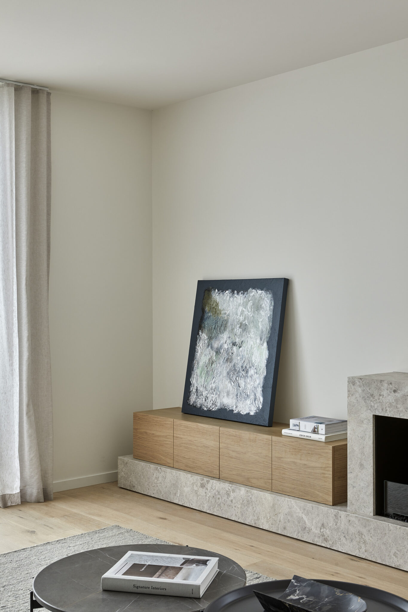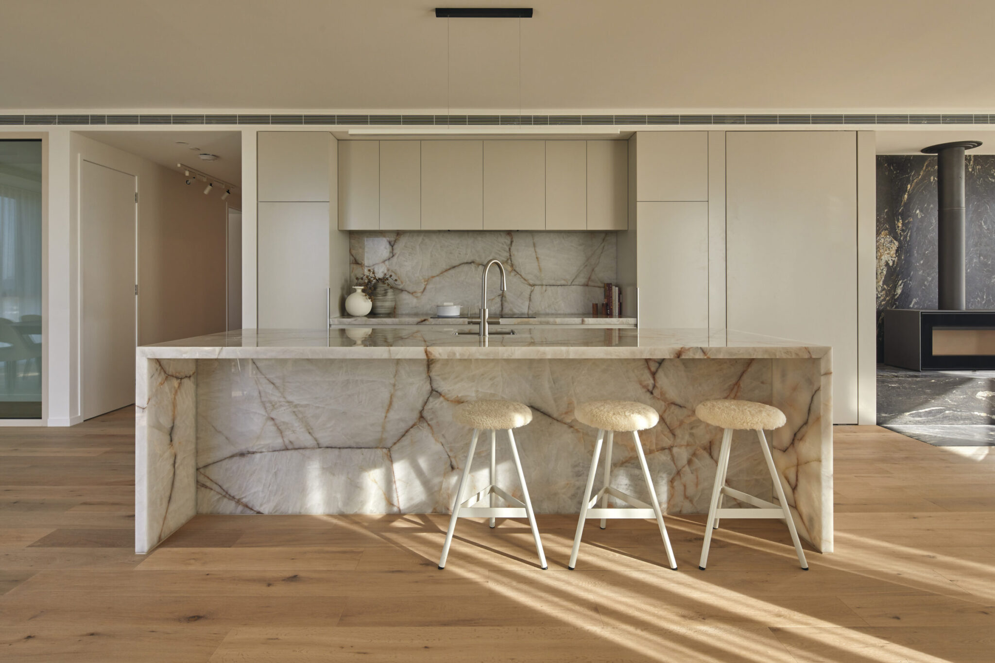 “At Hampton Hill, internal finishes echo the external palette; the two-tone concrete and brickwork of the facade becomes the ash timber and stone benchtop in the kitchen. Interior schemes mimic the tones of the bay, from the integration of soft seafoam shades to the bleached timber of the Hampton Pier. These complement the textured concrete and sandstone tones of the exterior façade, referencing the site’s seaside charm.”