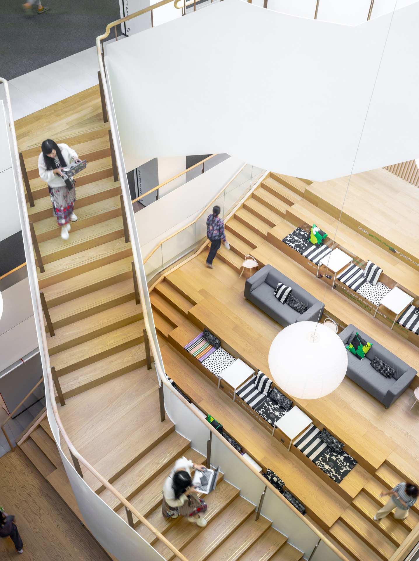At its core, a sculptural oak-clad staircase spans five levels, functioning as more than just circulation – it becomes social infrastructure. Its stepped design serves as seating, impromptu meeting spots, and event space. Surrounding zones include a café and library for casual interactions; FIKA (coffee break culture) areas with modular furnishings; and curved wood batten screens that carve intimate niches within generous volume, creating a rhythm of social pockets. By blurring boundaries between movement and gathering, the plaza becomes an adaptable space that aligns with client’s vision of “creating great meeting places”.