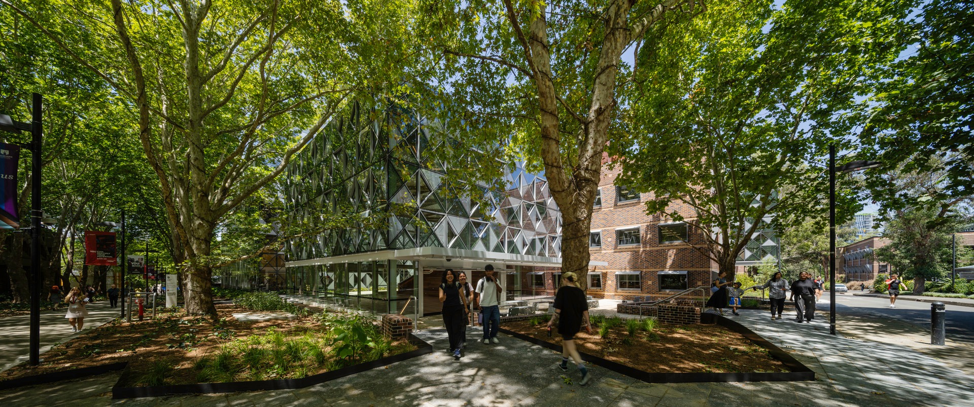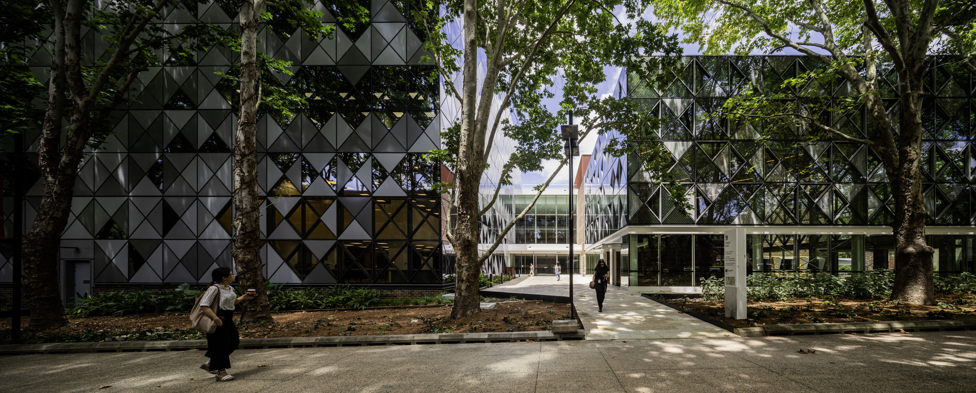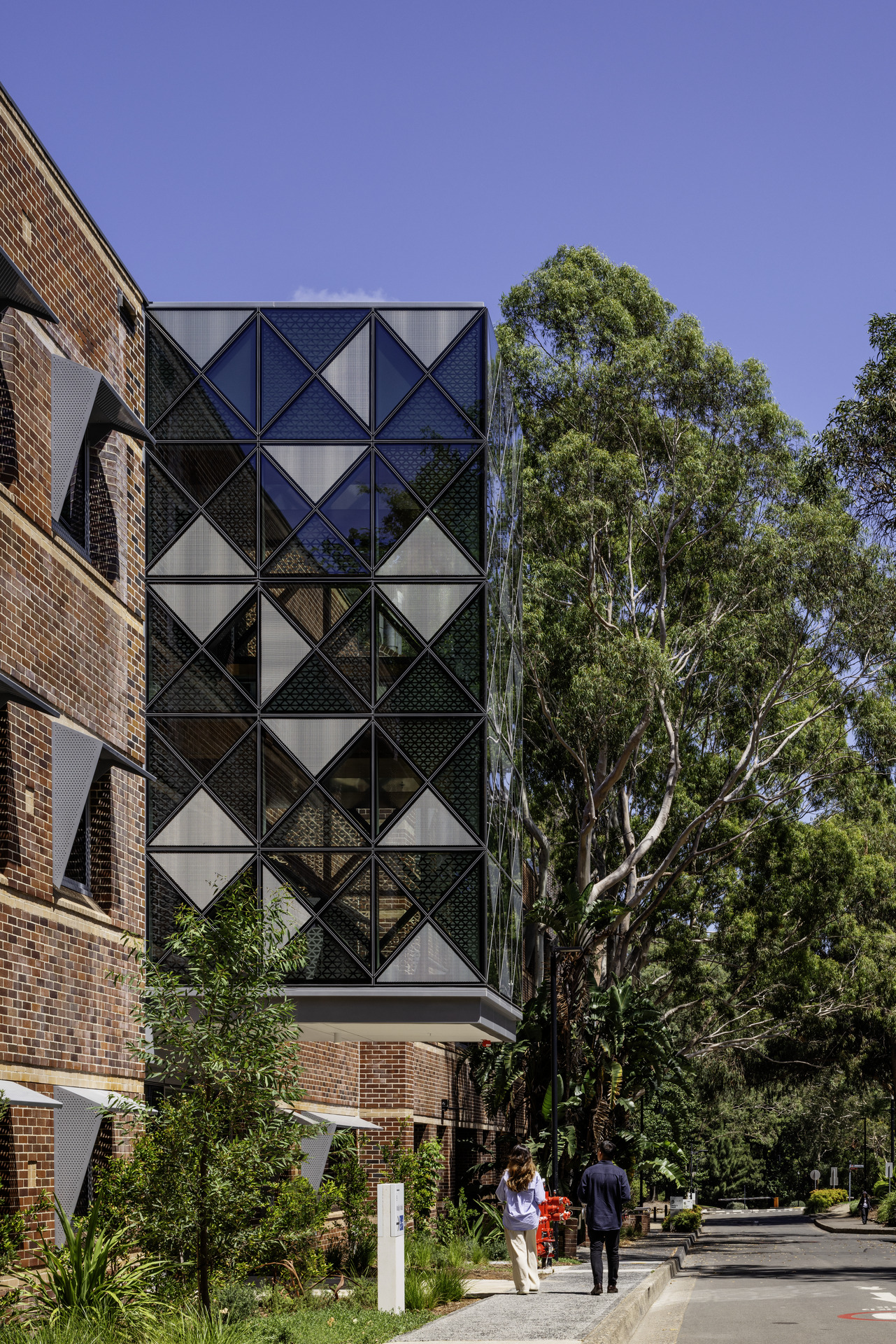 With so many disciplines under one roof, materiality needed to be both expressive and pragmatic. The architectural approach emphasises robustness, clarity, and a confident modesty. The existing brick building remains legible and is strengthened through upgraded glazing and shading, while the new wing introduces a distinctive metal façade—a triangulated pattern inspired by the dappled canopy of Wally’s Walk and the structural logic of engineering trusses.