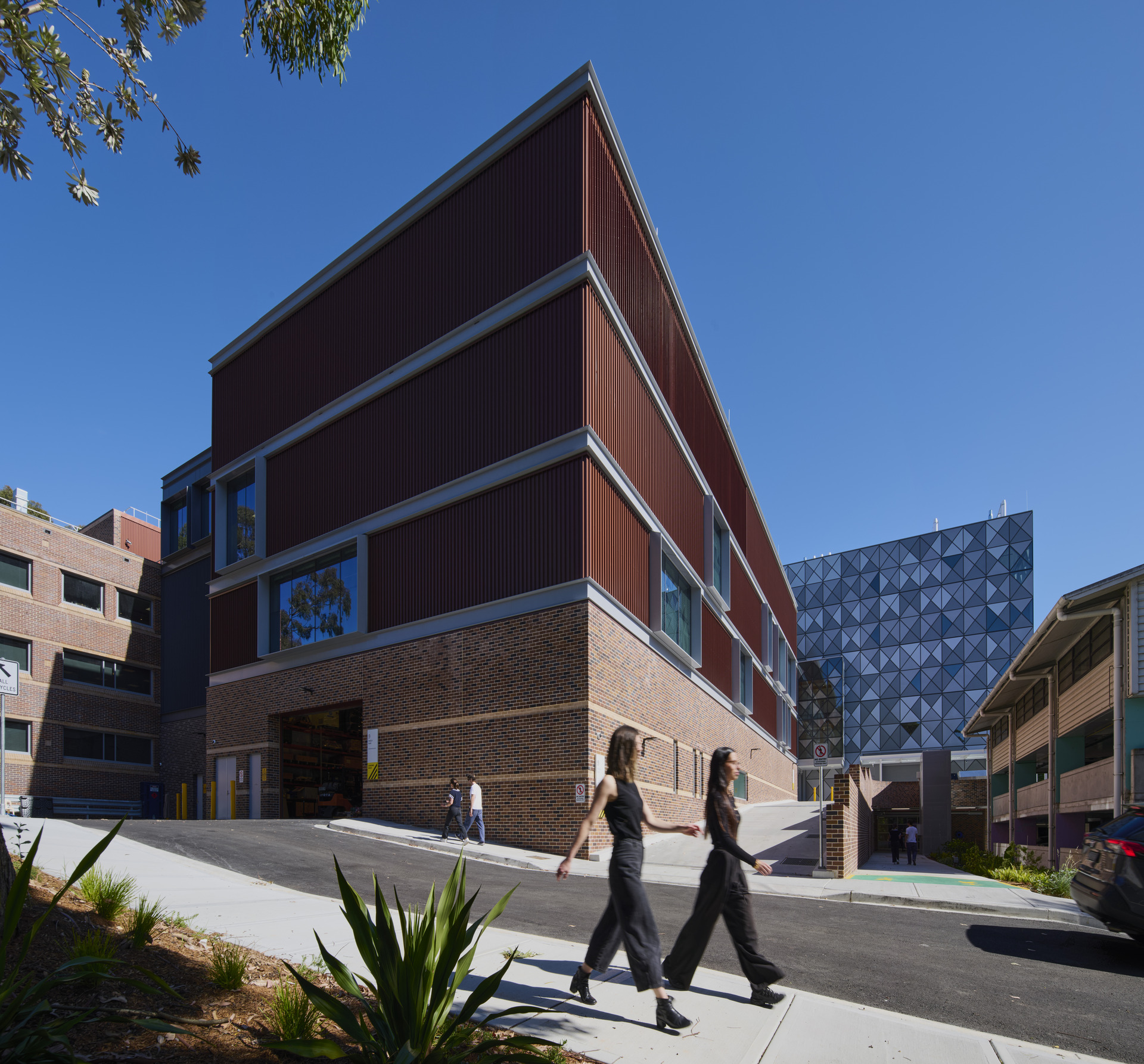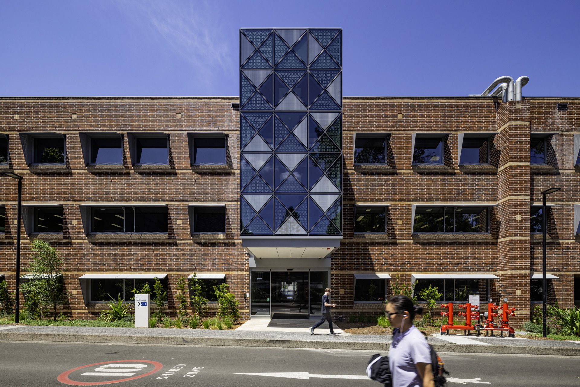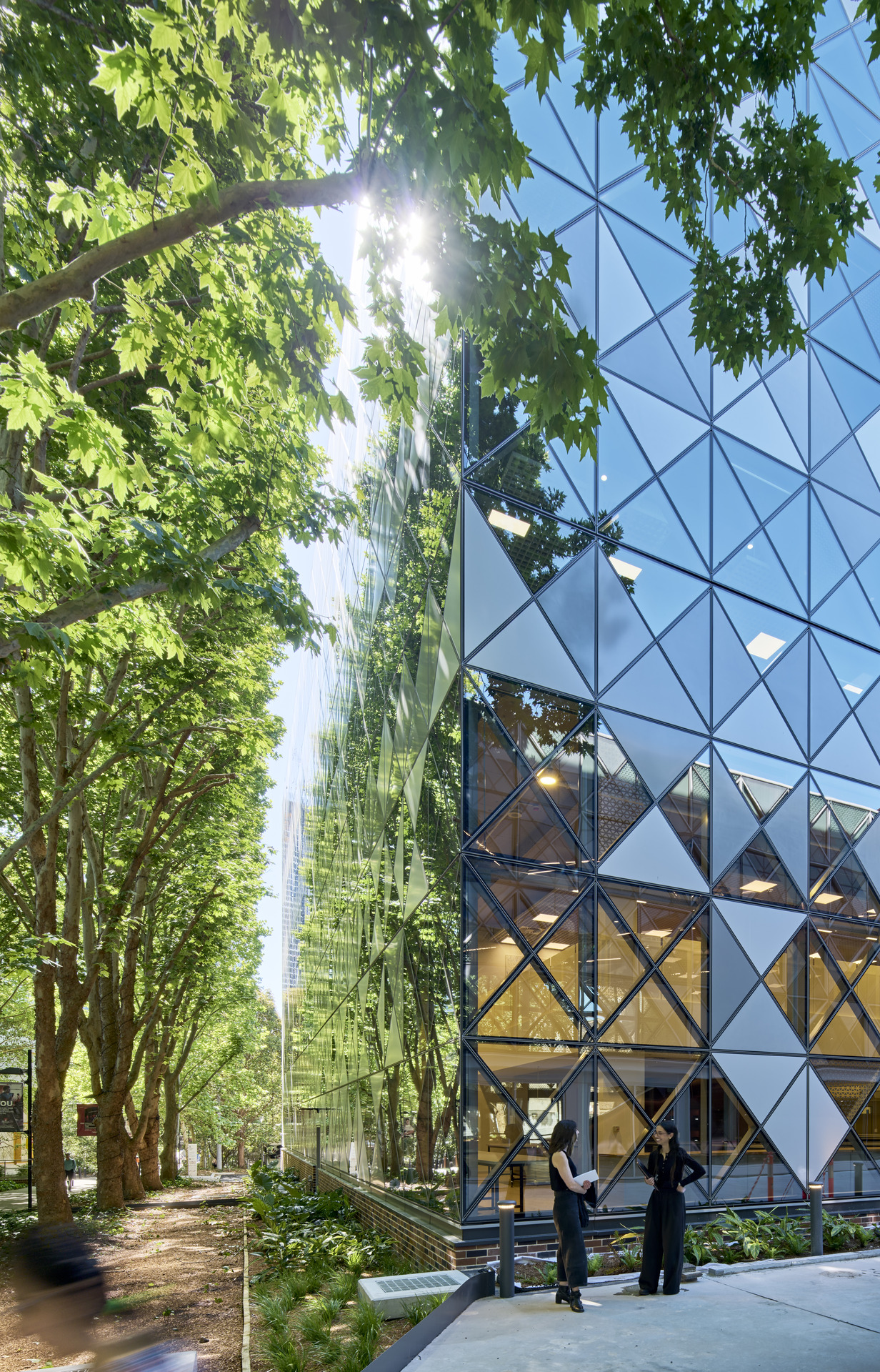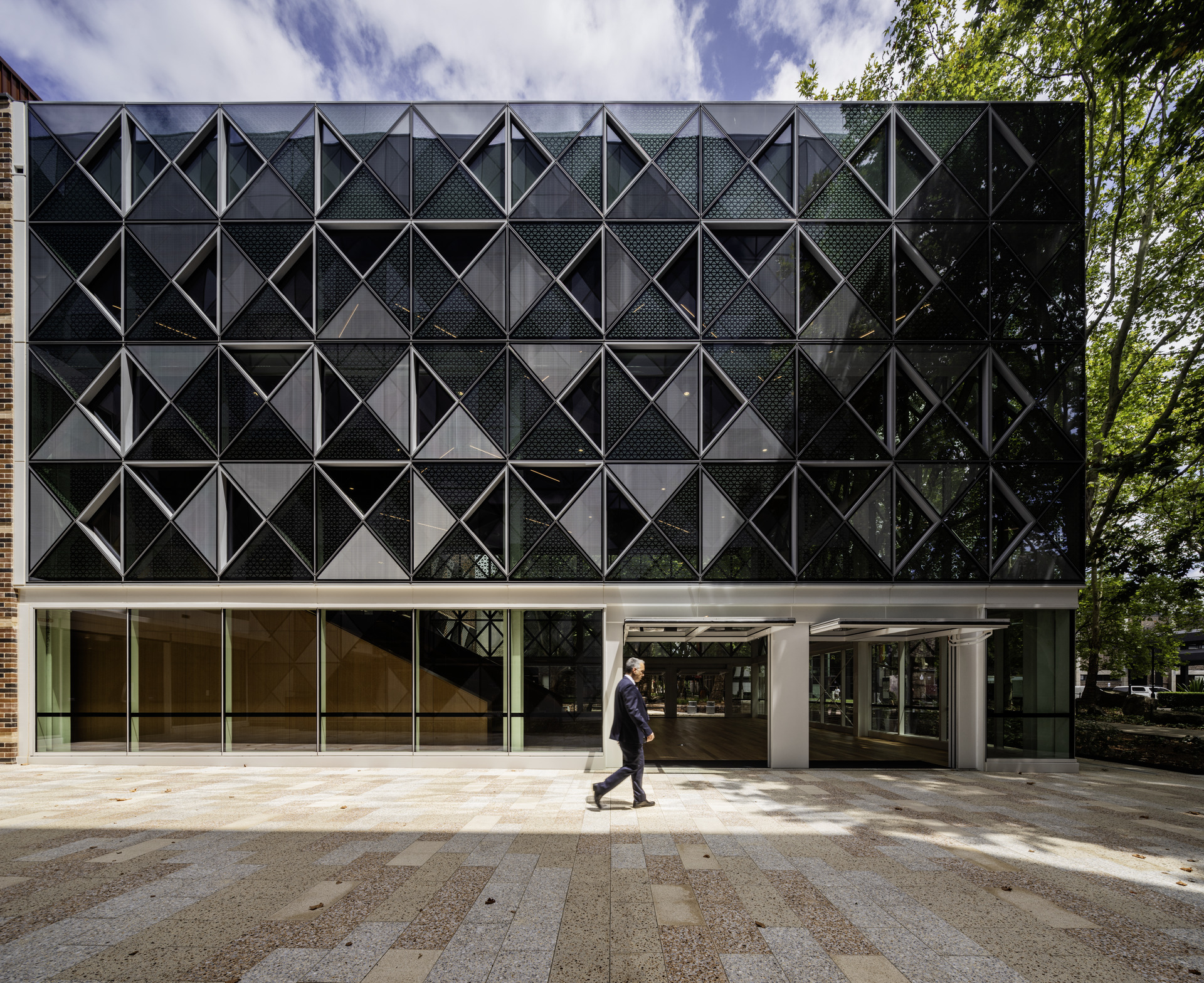With so many disciplines under one roof, materiality needed to be both expressive and pragmatic. The architectural approach emphasises robustness, clarity, and a confident modesty. The existing brick building remains legible and is strengthened through upgraded glazing and shading, while the new wing introduces a distinctive metal façade—a triangulated pattern inspired by the dappled canopy of Wally’s Walk and the structural logic of engineering trusses.