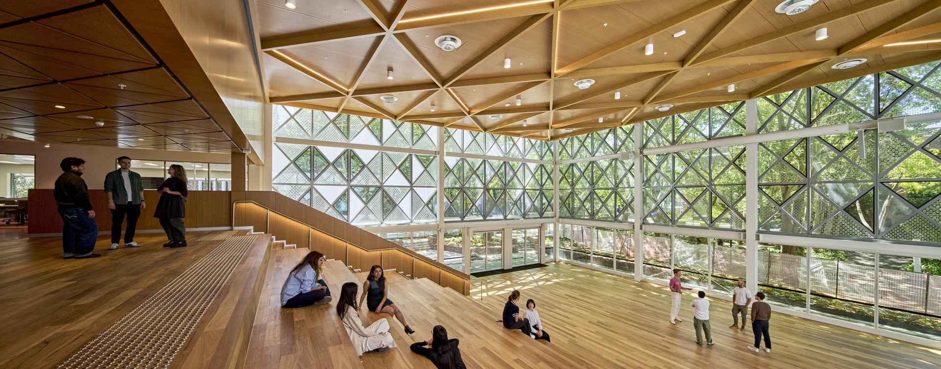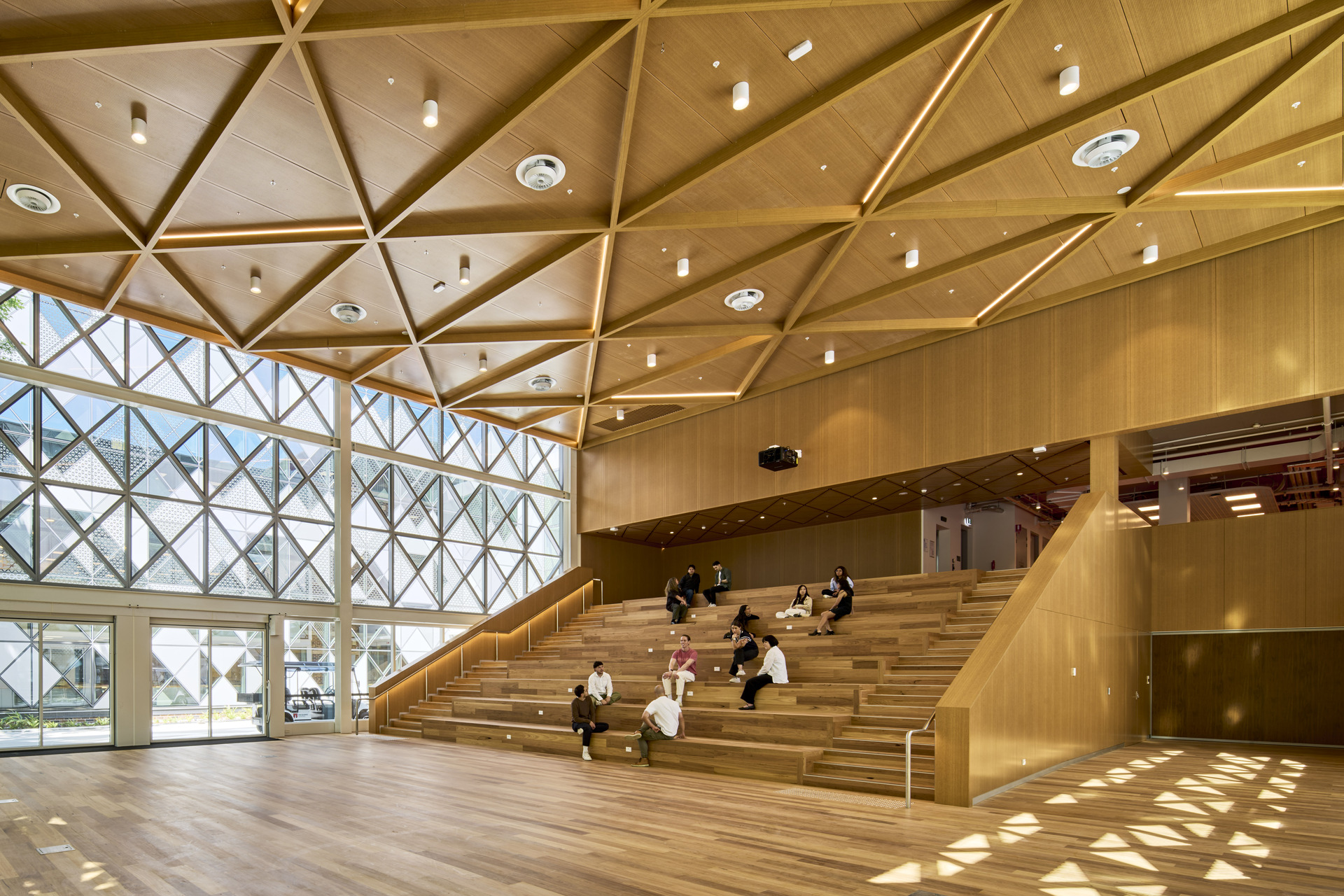 A new extension at the front of 9 Wally’s Walk anchors the corner of Wally’s Walk and Eastern Road, creating a direct visual connection into the engineering building. Named The Forum, this amphitheatre space hosts lectures, film screenings, and presentations in one of the campus’s most visible locations. It is a space designed for engagement: students connect with the pedestrian flow outside, while passers‑by catch glimpses of the creativity within.