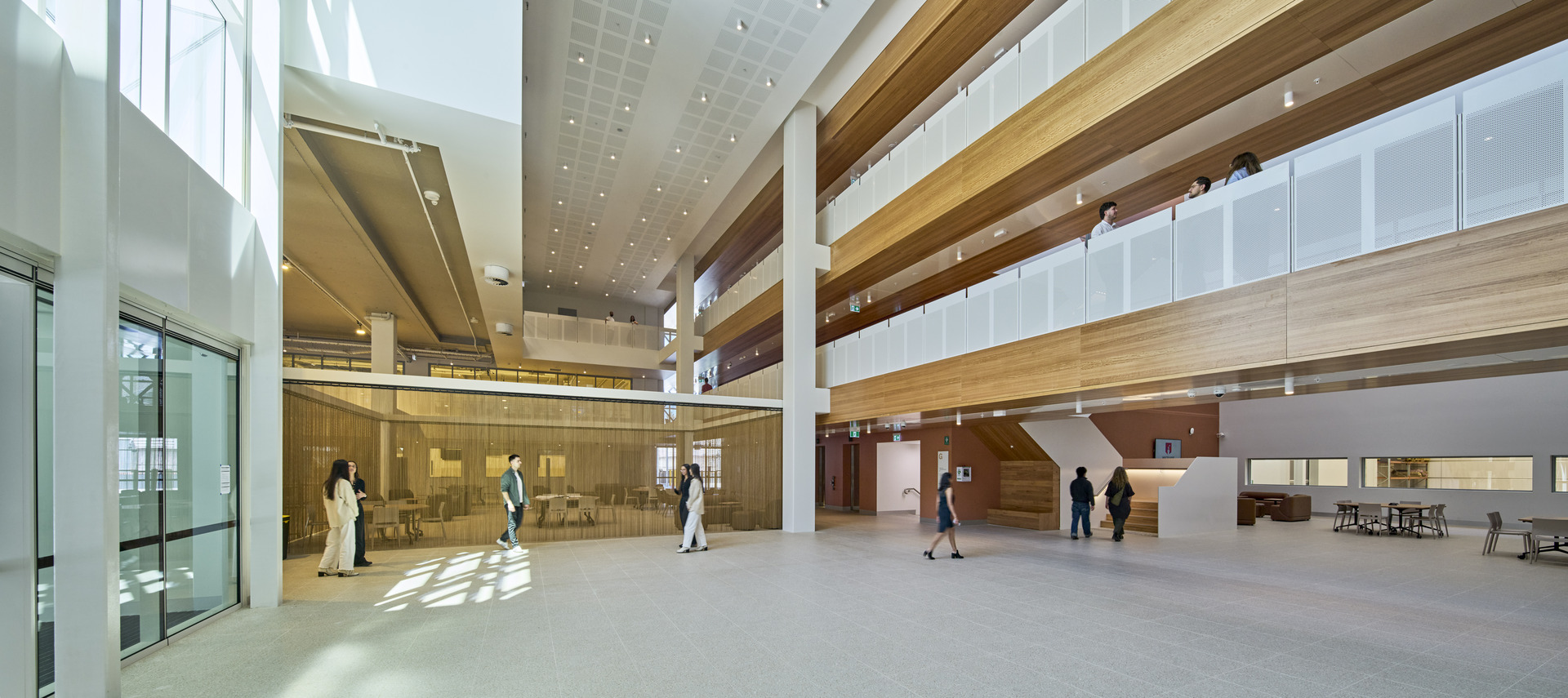 The central Field exemplifies this multi‑modal thinking. Students can sit eating lunch, working on homework, or testing fabrications, while evening and weekend events transform the same space into a community hub for presentations, robot competitions, and student showcases. Informal learning terraces, an open forum, and a suspended mezzanine observation deck create a dynamic, interactive atmosphere.