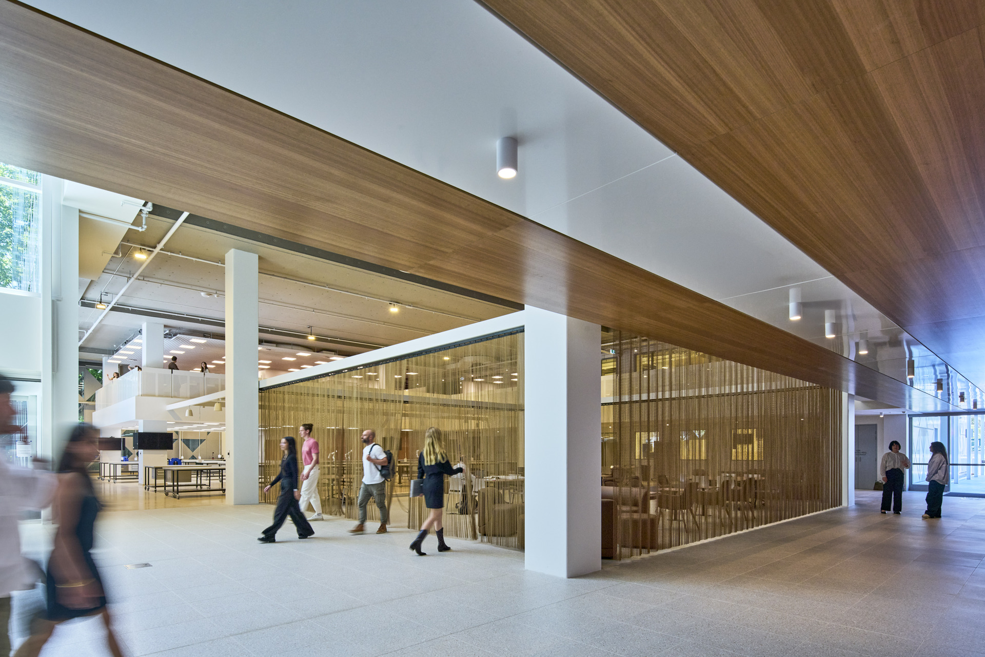 Further along, a series of glass‑fronted student club garages extends the notion of visibility. Here, engineering teams work on year‑long projects within workshop bays that operate as miniature storefronts of ideas in progress.