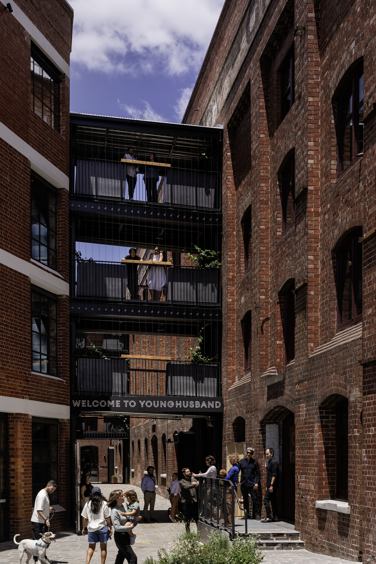 New interventions include modern glass lifts and external link bridges suspended over the bluestone laneway to improve access and add animation within the building.