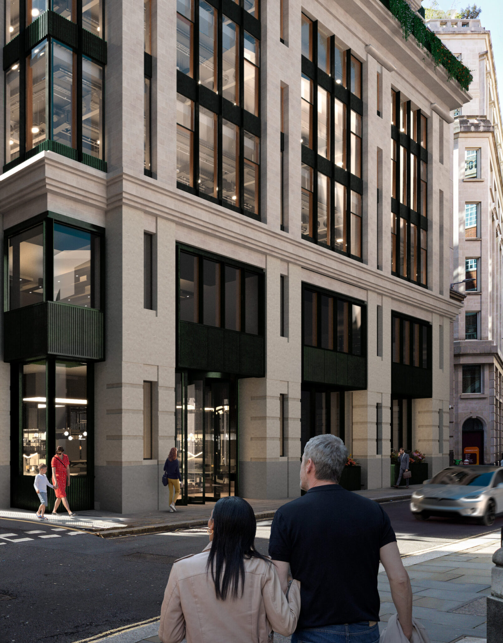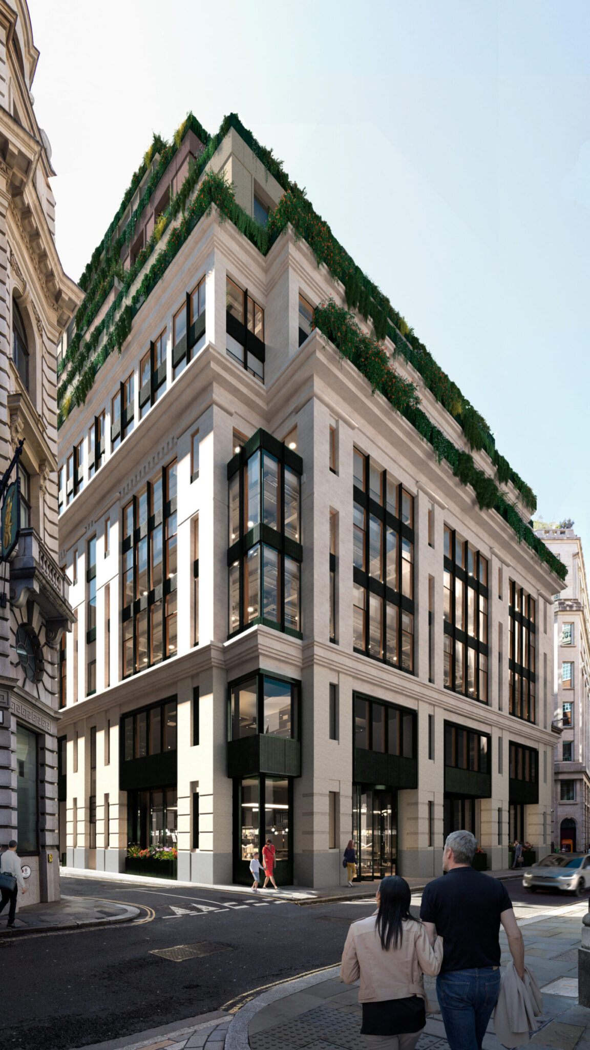 在伦敦伦巴德街21号,原有的铝窗被替换为木质复合型条形幕墙,同时采用轻质预制混凝土搭配木质复合窗打造了新的立面。这些优化措施使新立面的隐含碳排放量减少了高达48%。