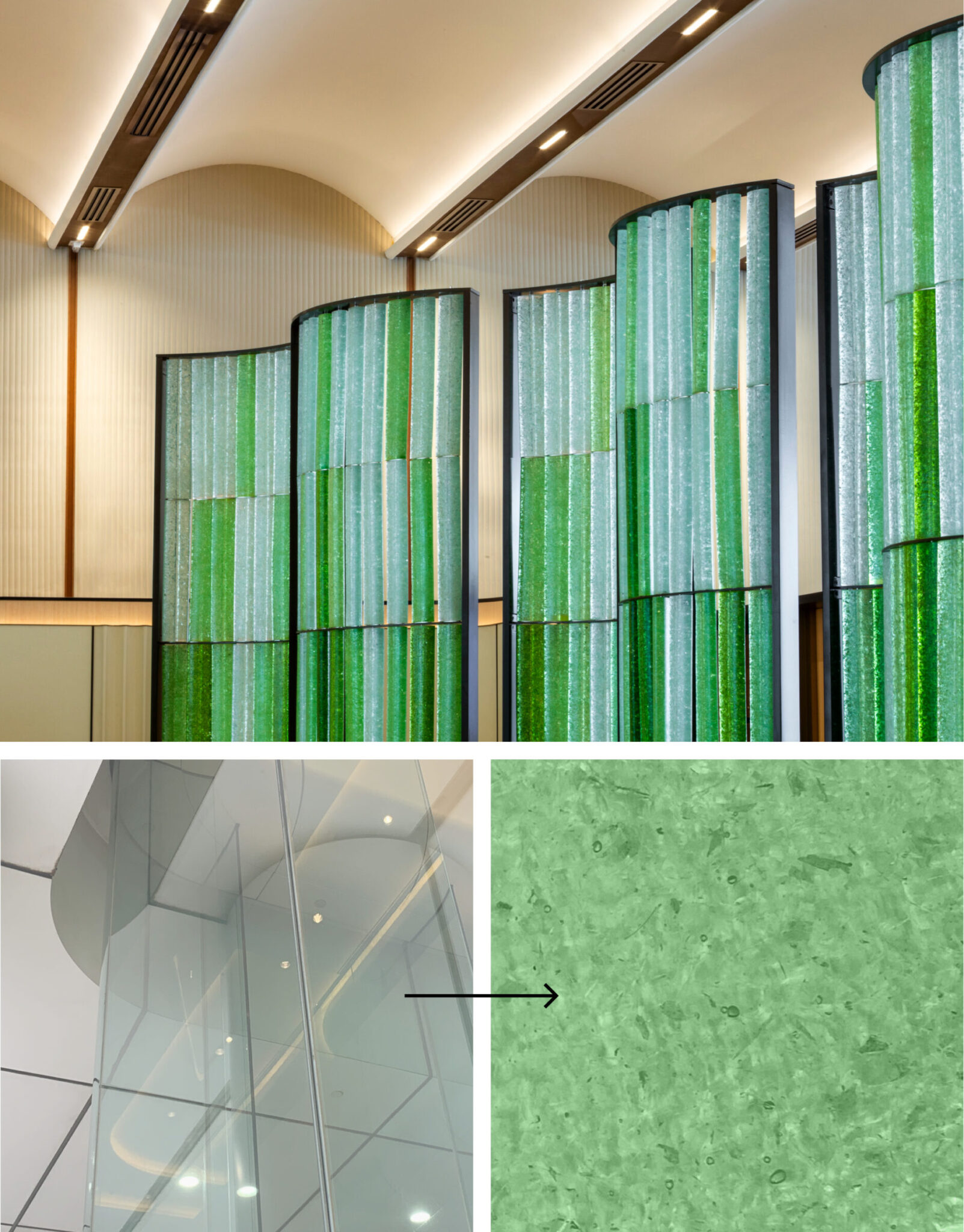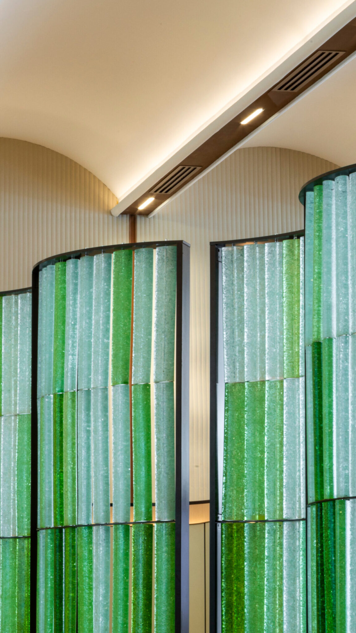 一块使用了30年的玻璃经过升级再利用,被制成接待屏风——面板——香港恒生银行总行。