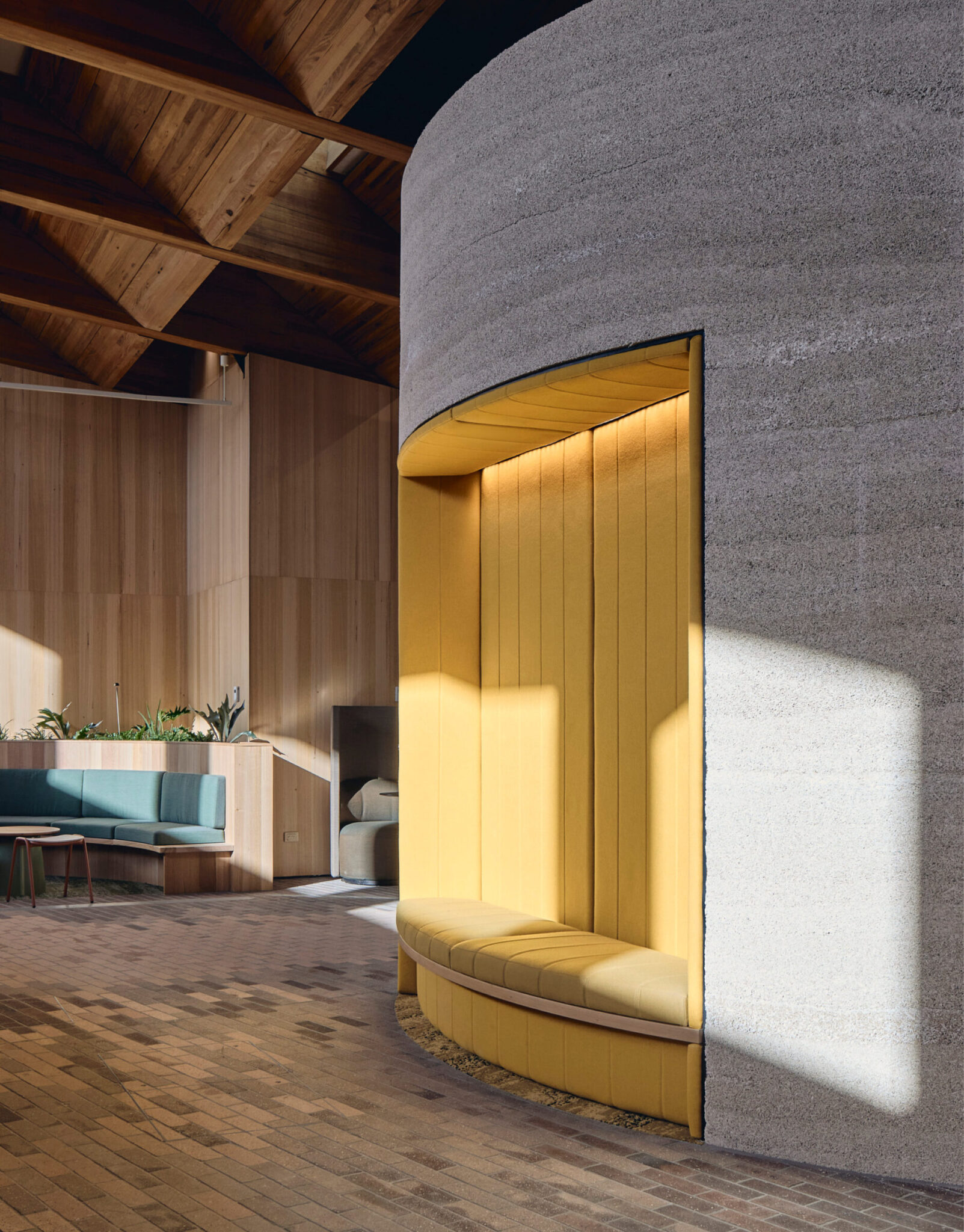 在塔斯马尼亚大学林业大楼的建设中,飞灰水泥——一种煤燃烧产生的废弃副产品,既能降低环境影响,又不影响结构性能——取代了传统的波特兰水泥。 混凝土混合料中加入煅烧粘土,每替代一吨普通水泥可减少约80至90公斤的二氧化碳排放。同样,项目中指定使用碳中和石膏板替代传统材料,并采用大麻混凝土取代常规墙体系统,该材料不仅具备优异的隔音、阻燃和透气性能,且在使用寿命结束时可完全进行堆肥处理。