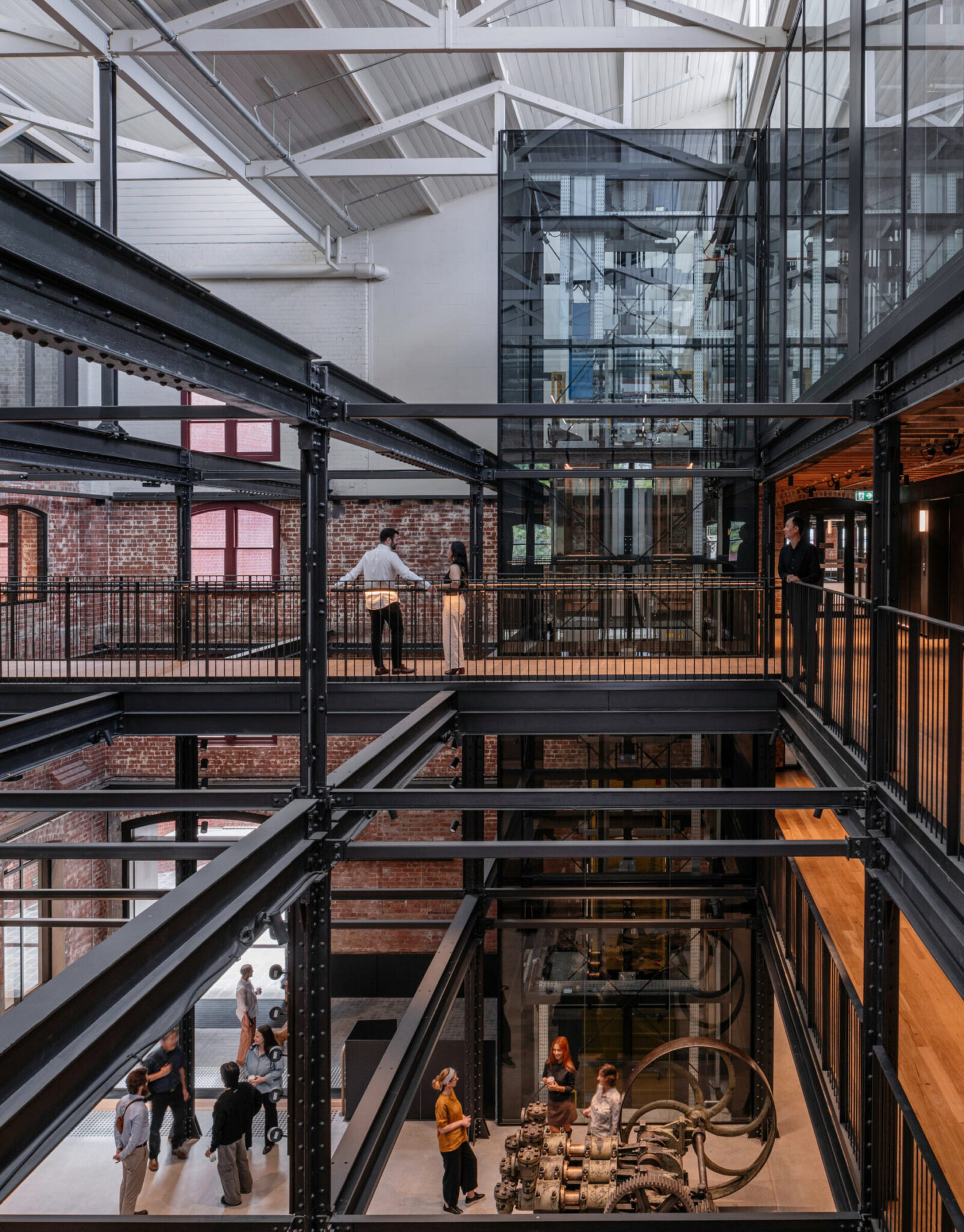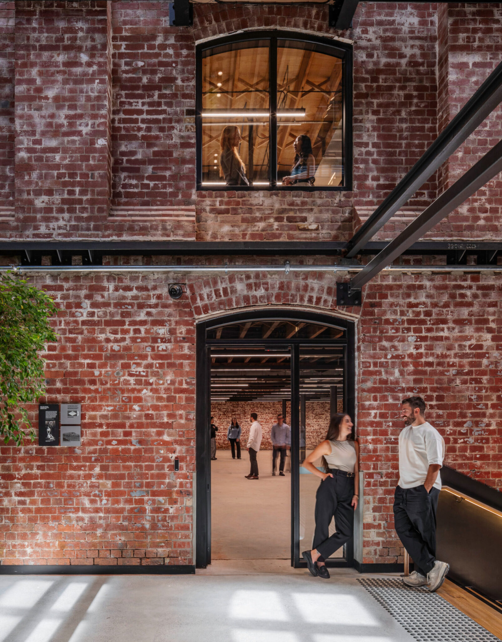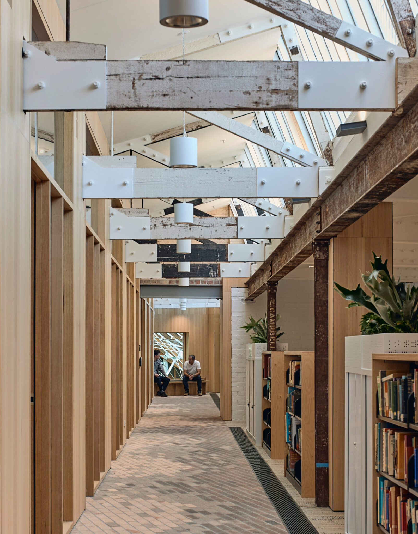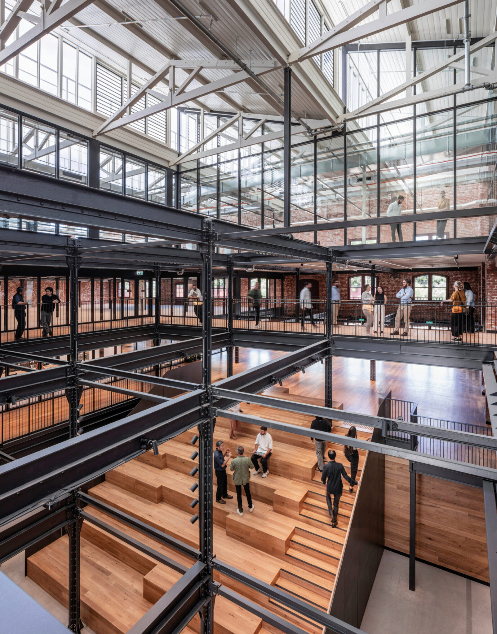 在墨尔本的扬赫斯班德(Younghusband)项目中,设计理念是尽可能轻柔地对待这座拥有122年历史的羊毛仓库——保留了包括已退役的包料升降机、羊毛滑轮、原始彩绘标识以及独特的锯齿形屋顶在内的历史元素。 原有的砖砌结构在整个项目中均被保留并重新利用;拆除的道格拉斯冷杉梁经当地工坊Timber Trip去除钉子并刨平后,被重新整合为公共区域的扶手台面和连接桥。整个项目中材料的再利用,使隐含碳排放量较同类参考建筑减少了84%,相当于节省了约1130万公斤的碳排放。
