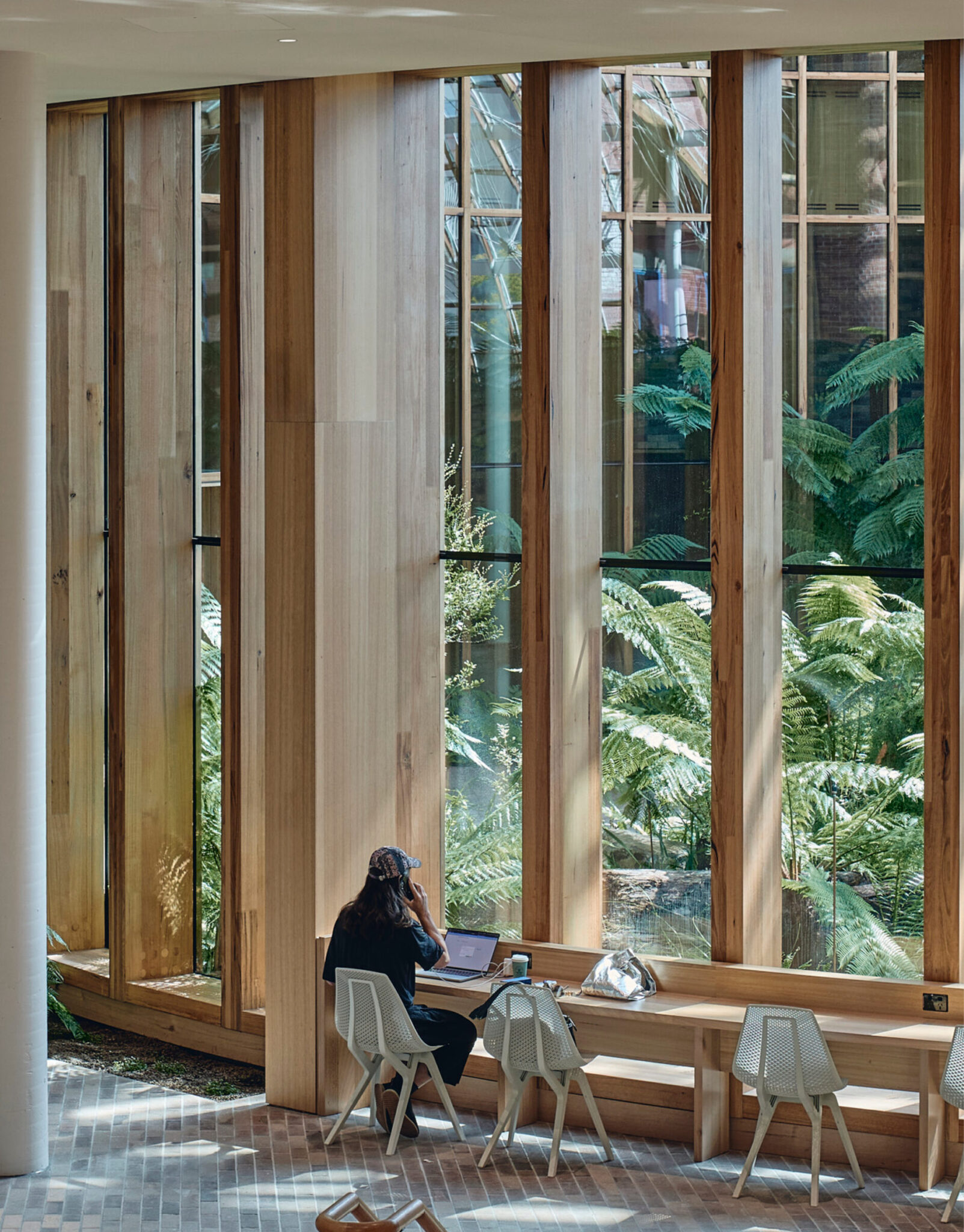 在塔斯马尼亚大学林业大楼中,大跨度木结构既起到了结构支撑作用,又兼具美学价值,因此无需额外进行表面装饰。无把手设计的细木工细节打造出一体化解决方案,在保持空间品质和耐久性的同时,有效减少了材料用量。