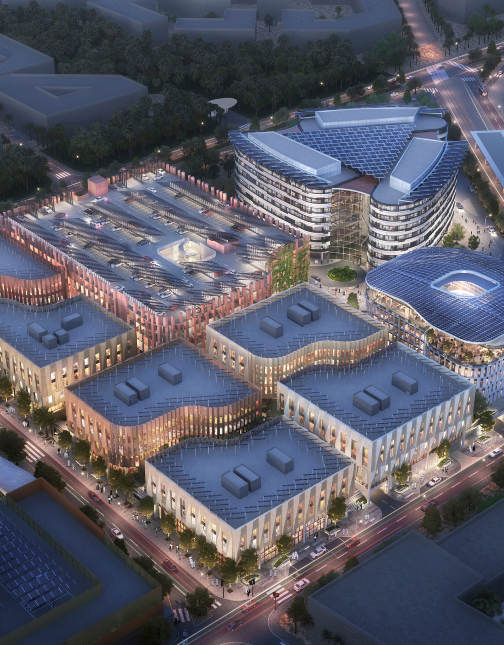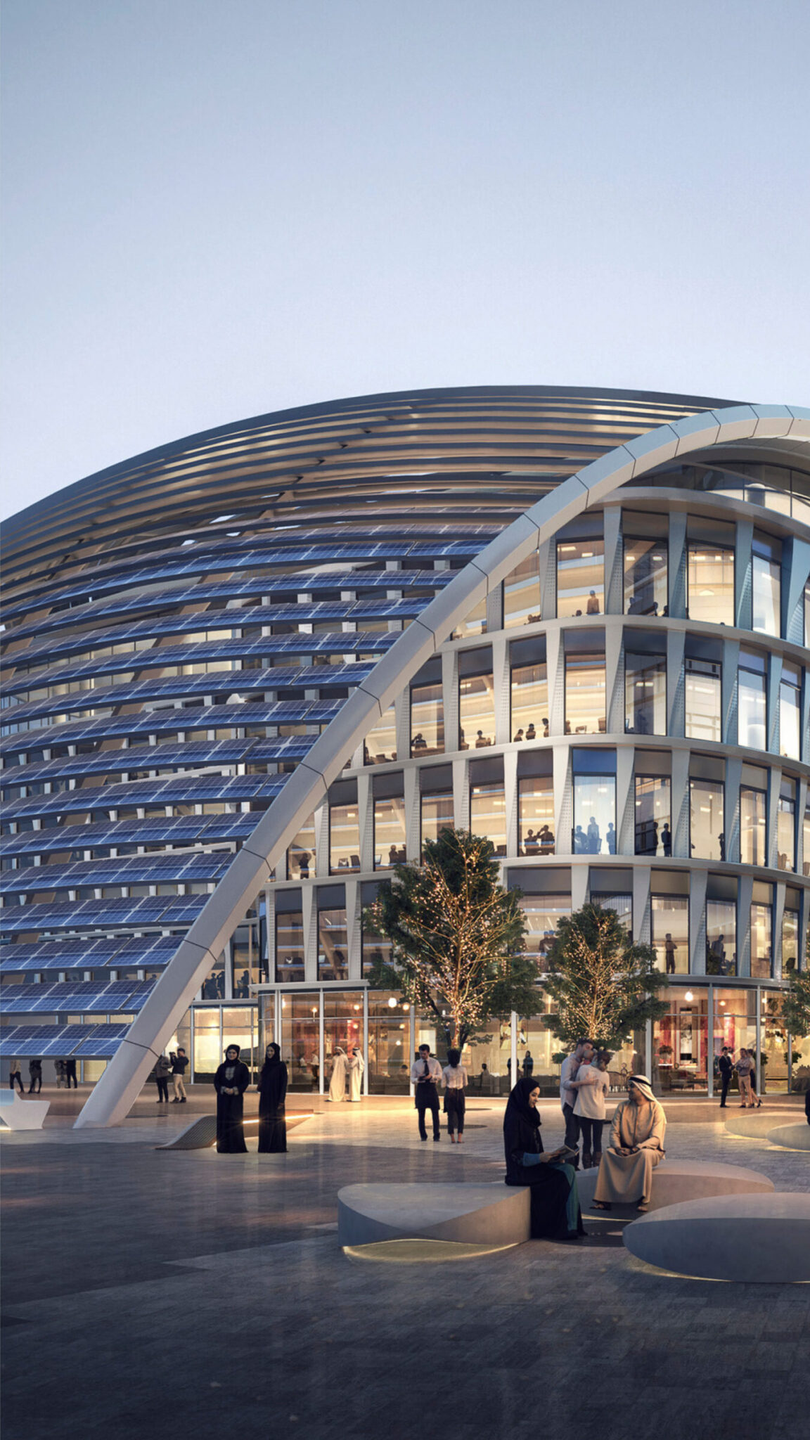 在阿联酋马斯达尔城的MC2项目中,覆盖建筑立面和屋顶的光伏遮阳棚经过反复研究进行了优化,以实现发电量的最大化,其发电量甚至超过了建筑本身的能耗。该园区的布局还融入了一套环境网格设计,旨在为公共区域遮挡沙漠烈日并引导自然微风,从而在单块光伏板产生一瓦特电能之前,就已降低了能源需求。