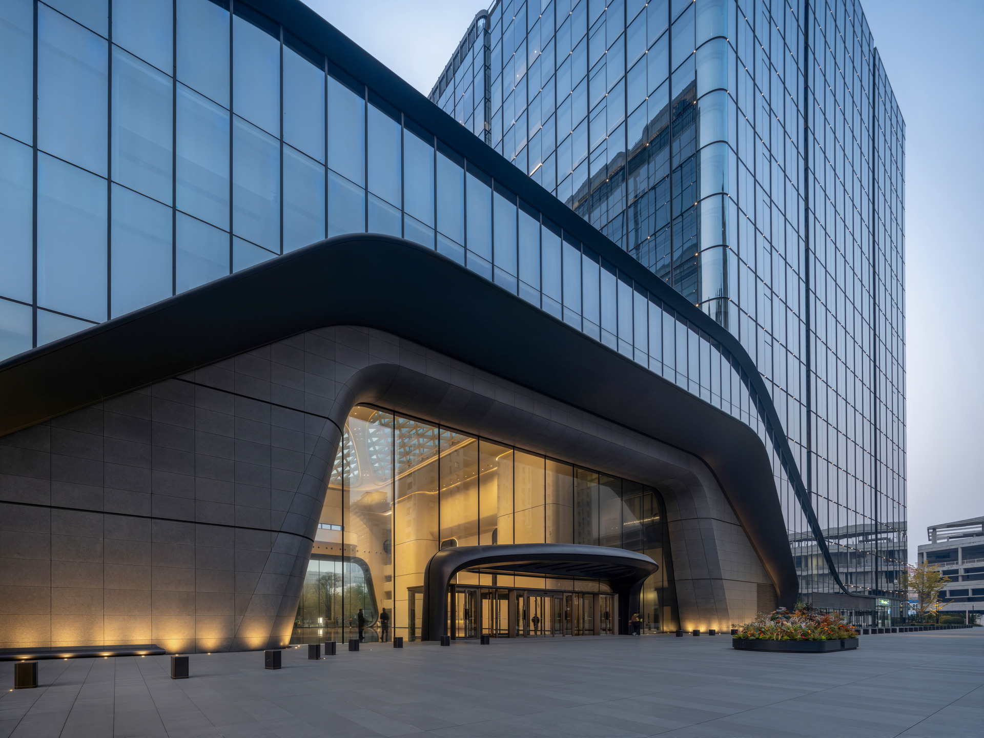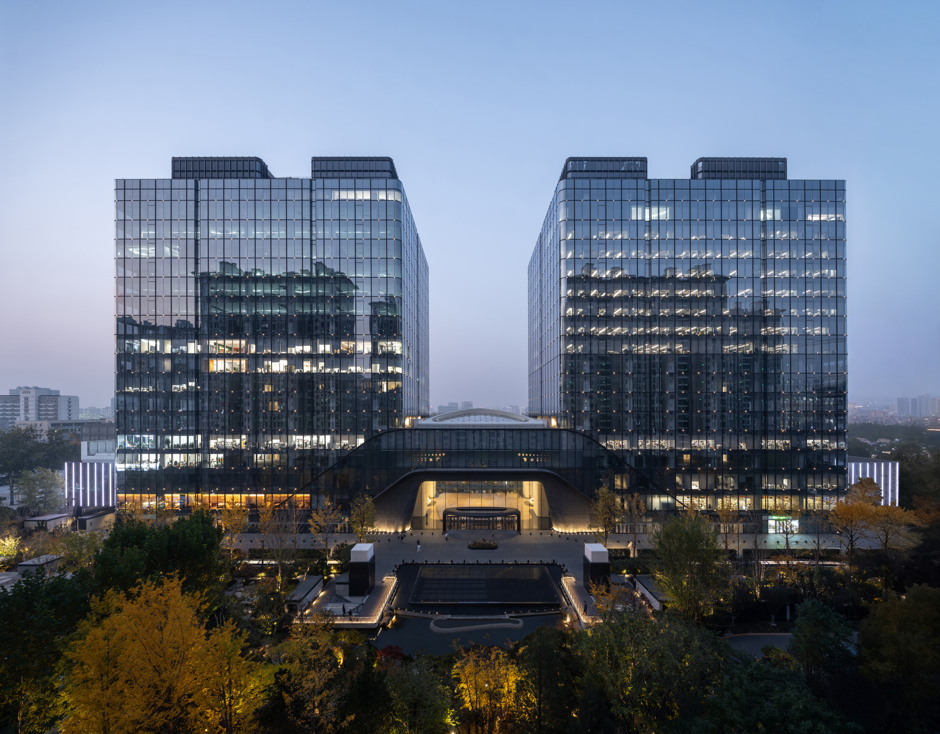 规划与立面设计采用模块化手法,体现了北京城市肌理的网格逻辑。玻璃与金属表面随光线变化而呈现不同效果,在通透感与温润感之间取得平衡。双层低辐射玻璃幕墙、外部遮阳系统以及多尺度景观空间,有效降低了能耗,改善了微气候表现,并加强了人与自然的联系。