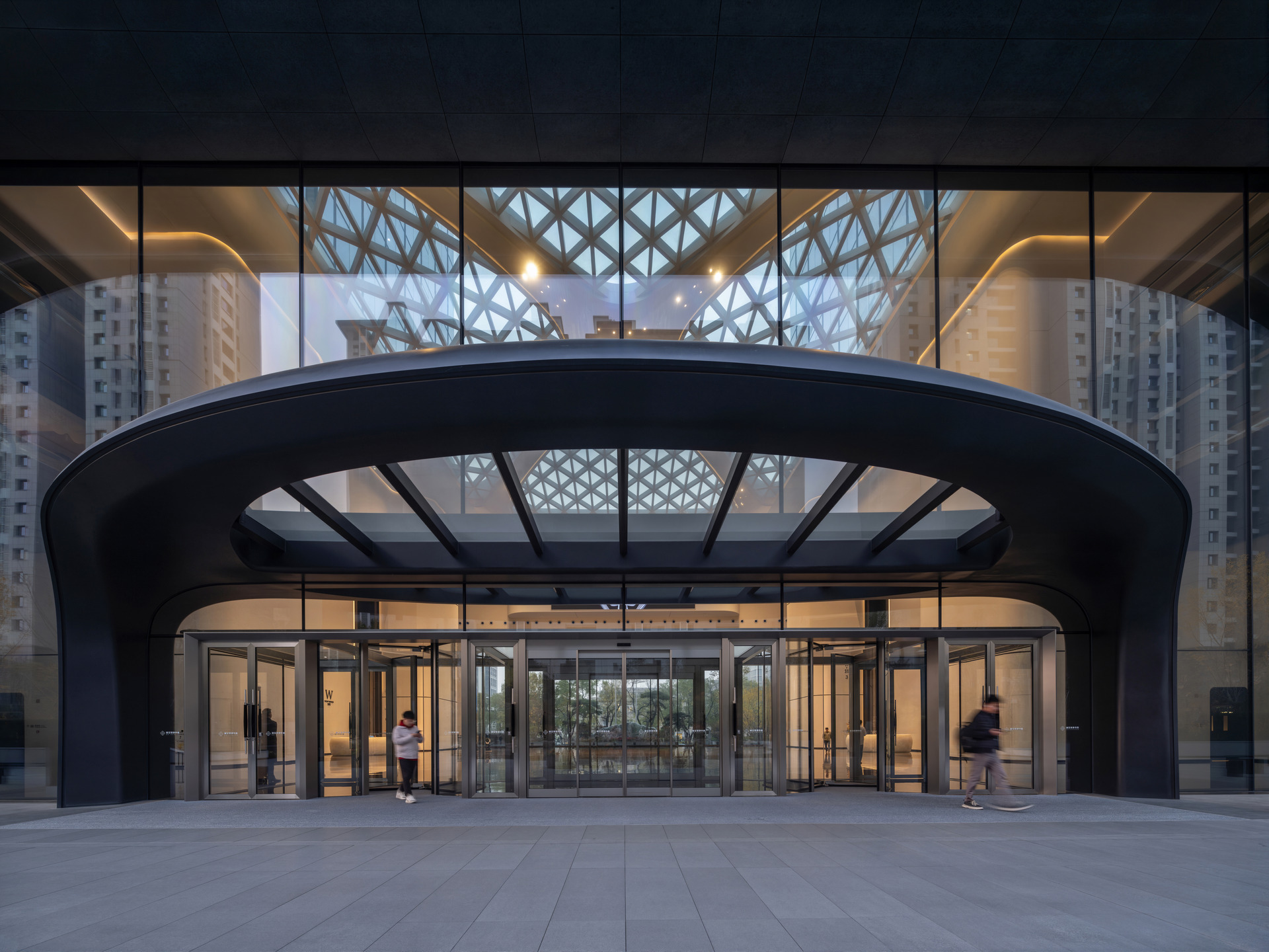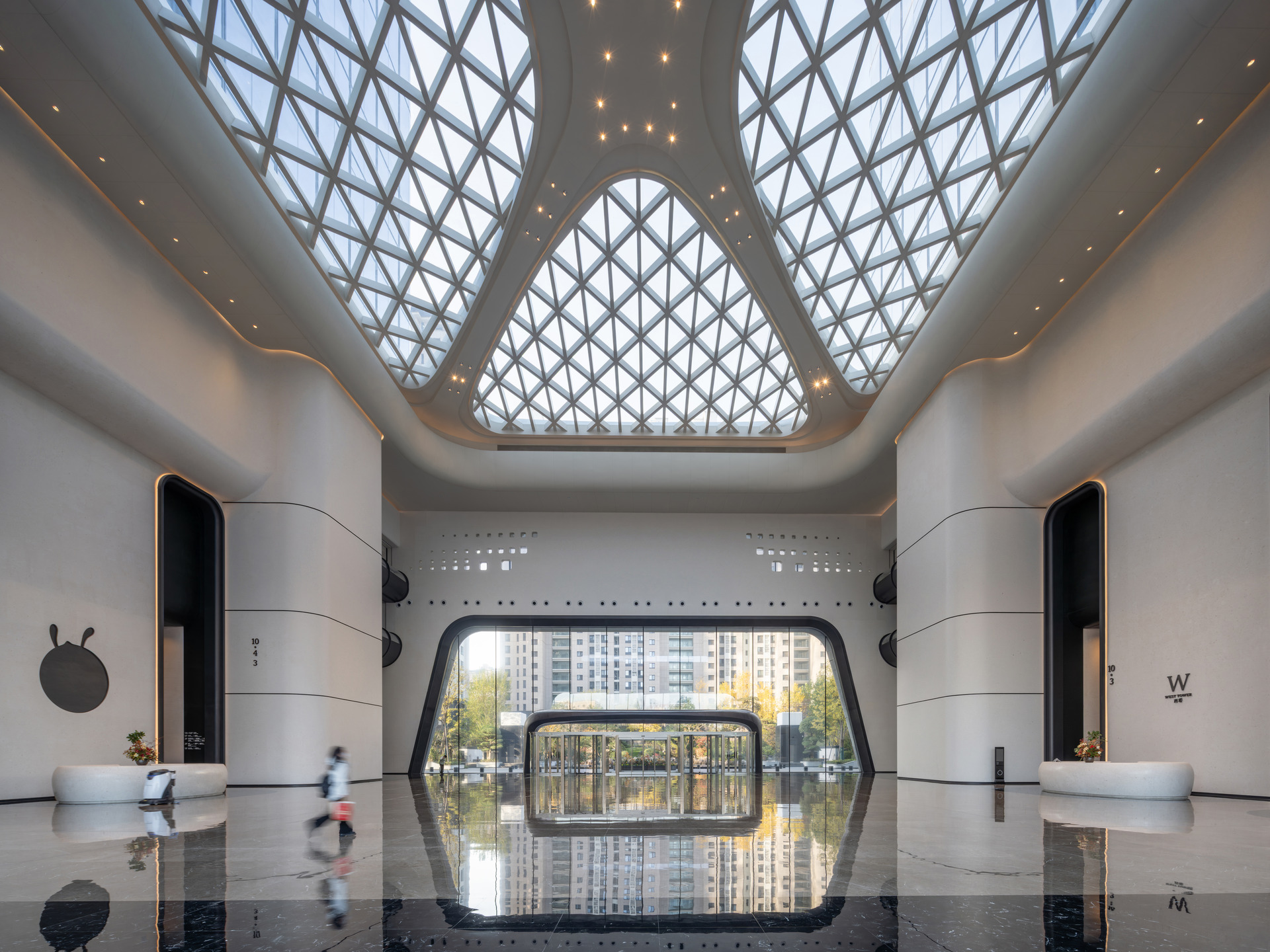 两座塔楼之间,规划了一个面积为2,500平方米、高26米的中庭, ,被设计为“城市大厅”。 该空间通过大面积玻璃幕墙向街道敞开,欢迎办公人员、当地居民、访客及周边科研人员,促进日常互动。