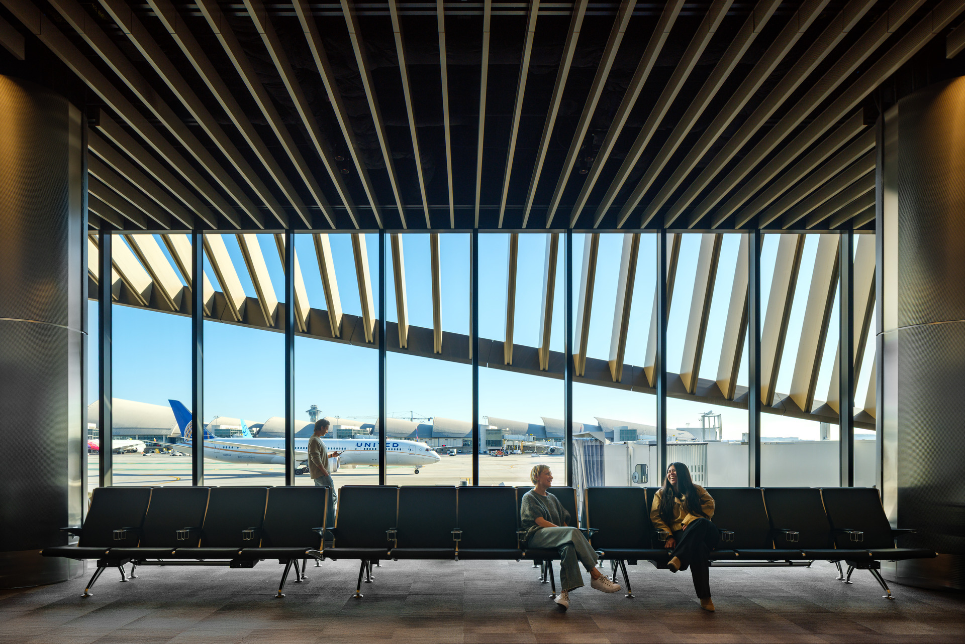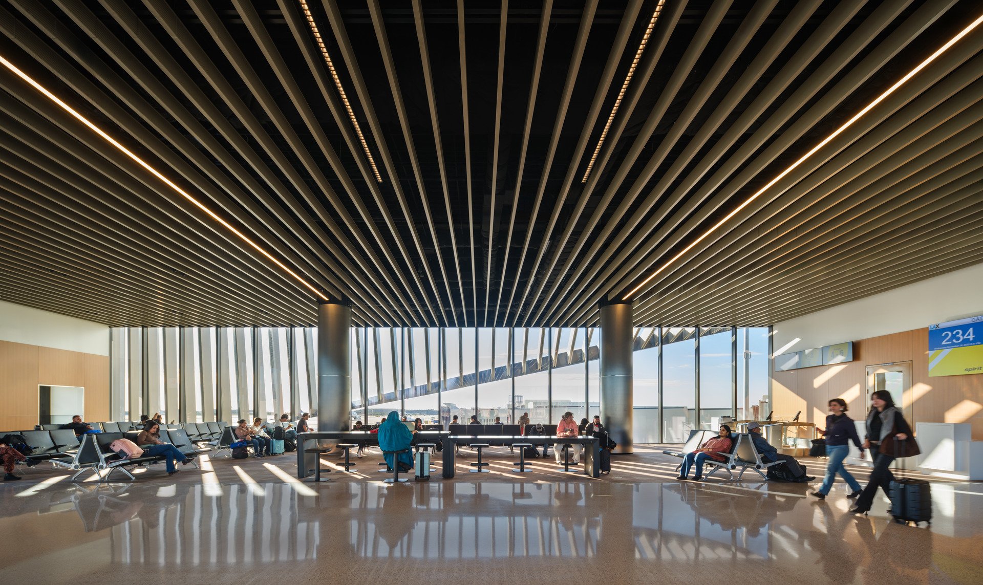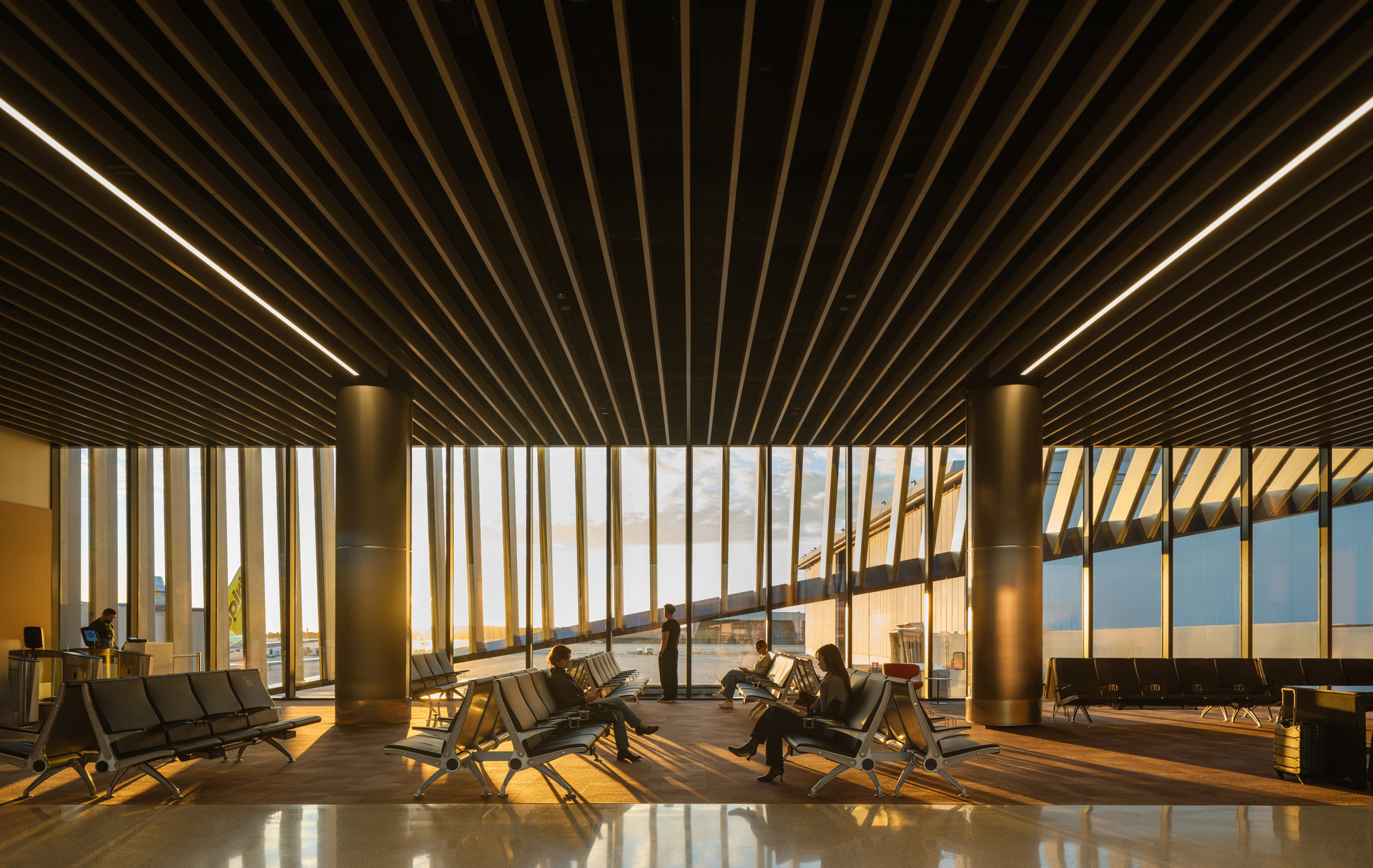 其用意在于唤起 一种““客厅”般的氛围,从而缓解登机前的焦虑,提升乘客的舒适度。从内部来看,该项目体现了机场设计领域更广泛的转变,即从单纯的过境空间向宜居空间的转变。